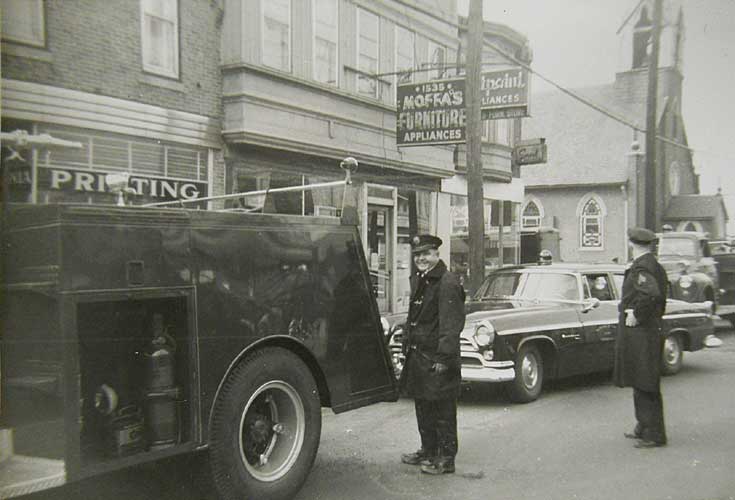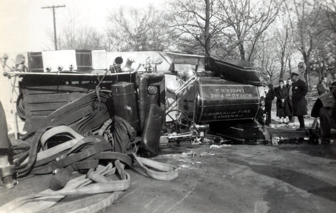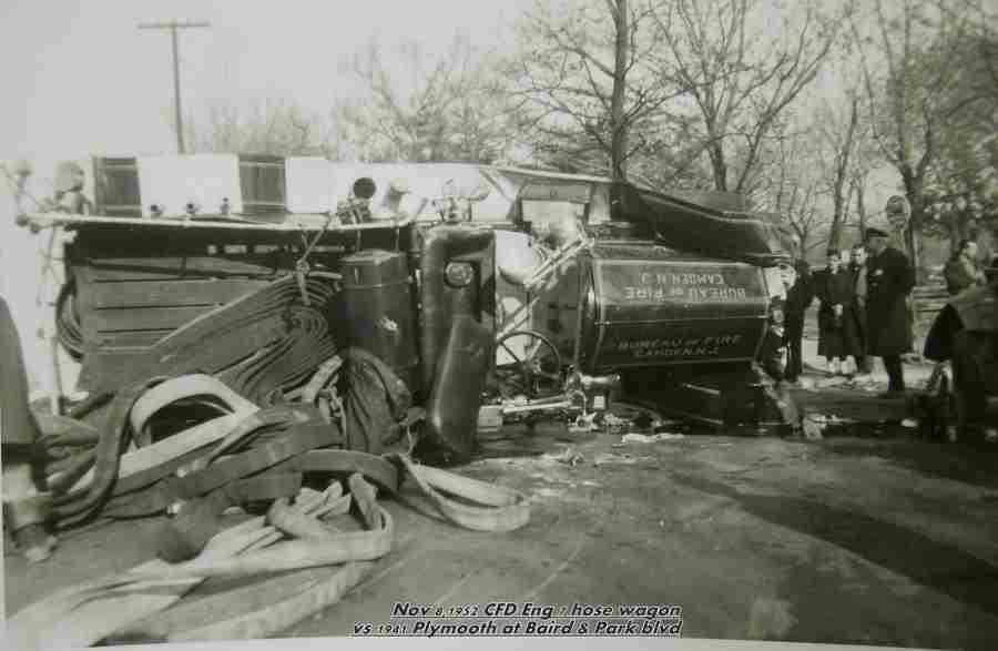 Camden Fire Department Engine Company 7 hose wagon vs. 1941 Plymouth at Baird Avenue and Park Boulevard; Police Department Sergeant John Ferry at far right |
