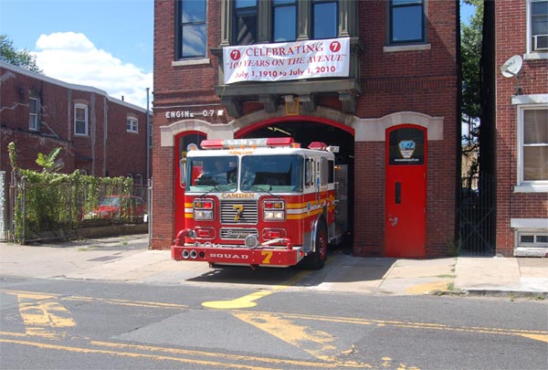 This unit was originally organized as Engine Company 7 on July 1, 1910 and entered service on the same date at 1115 Kaighn Avenue in South Camden, where it has remained in service in its original building ever since. The unit was re-organized from an Engine to a Squad company on August 1, 2003 at 0700 hours. Squad Company 7 has recently been re-equipped with a new Seagrave Rescue Pumper, and many power tools for heavy-rescue assignments. On July 1, 2010 Squad Company 7 celebrated its 100th anniversary at the Kaighn Avenue firehouse. Retired Camden firefighters, firefighters from other municipalities, friends and members of the press were made welcome by the on-duty firefighters. |