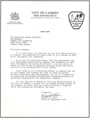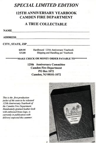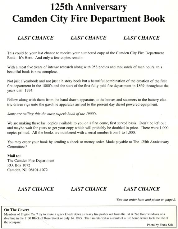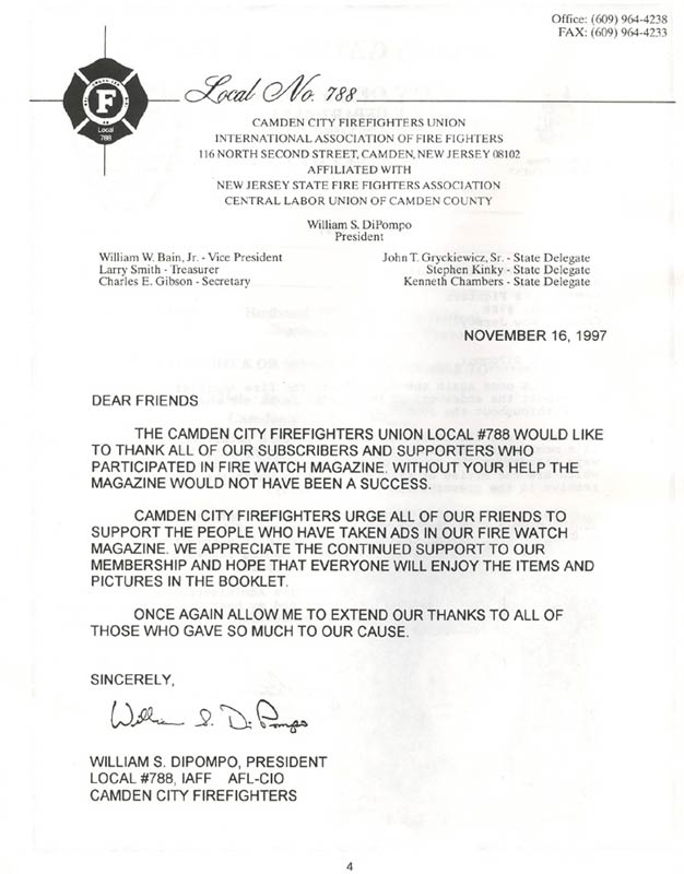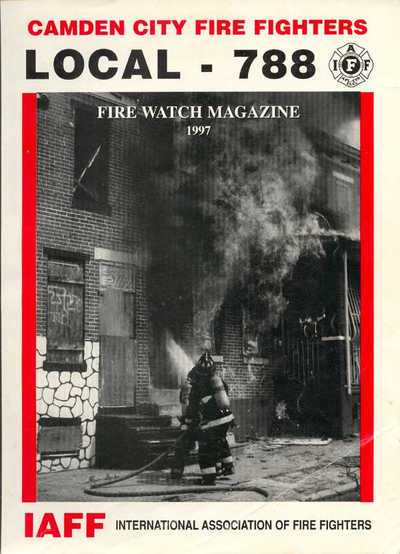 Members of the Camden Fire Department over the years been represented by different union and fraternal organizations, including the International Association of Fire Fighters, the International Association of Fire Fighters, the Brotherhood of Professional Fire Fighters, the International Association of Black Professional Firefighters, and the Society of Camden Latino Fire Fighters. Local 788 also published FIRE WATCH MAGAZINE in the 1990s, which detailed the activities of the Department in its annual issues. With photo and articles by Bob Bartosz, Joel Bain, Frank Saia and others, the magazines are a real treasure. It is an honor to be able to present these accounts of the activities of Camden's fire fighters here, and I hope to be able to reproduce several issues on the website in time. If you can identify anyone not named in the photos on the website, or if would like to see other images or stories posted, please comment at the bottom of the page.