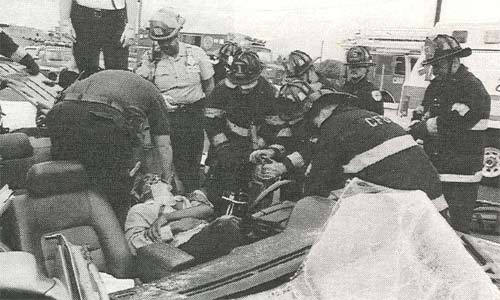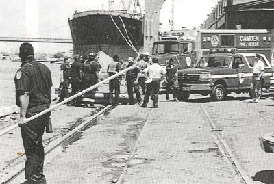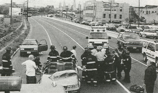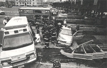 At this time various Camden EMS and Medic Units were also being dispatched. What everybody did not know at the time was that there was no one trapped at the collapse bridge site and that all the activity of the rescue operations would be taking place 1/4 of a mile from the accident scene. As Engine 7 now entered the deserted highway they came across the collapsed car with the trapped victim. Rescue 1 and Engine Co. 9 and Battalion 2 were now arriving on the opposite side of the highway. The EMS Squads were unable to reach the victim to access his condition so Captain Paul Escher of Rescue 1immediately had members place two jaws of life into service. The victim appeared to be unconscious at the time. Camden fire fighters removed the roof of the auto allowing medics to treat the injured victim who was going in and out of con-sciousness. Other fire fighters were now at the second auto finding only four crying children and mother who were not injured. And as one fire fighter put it, "lucky to be alive." Fire fighters continued to use the Jaws to remove the drivers door and side panel enabling fire fighters to remove the victim. He was then rushed to Cooper Medical Center in Camden. He was treated for cuts and bruises and released later that evening. It was a miracle that he survived this accident.