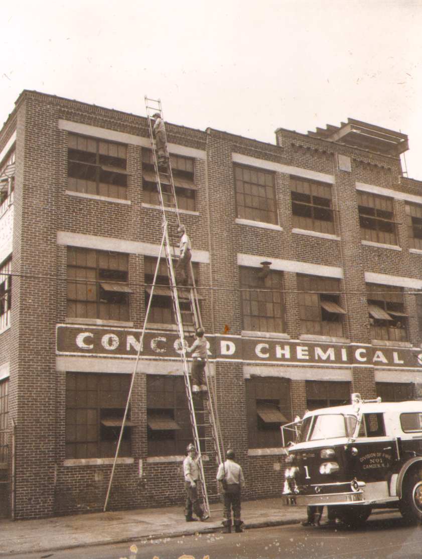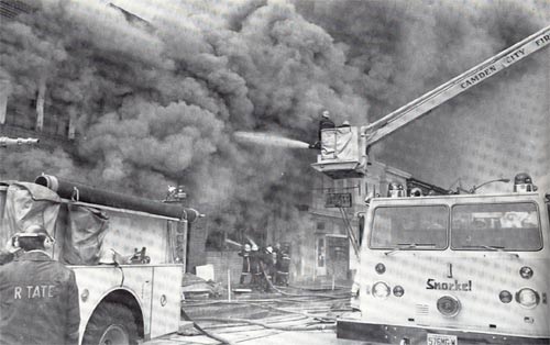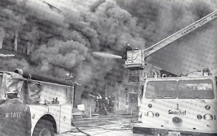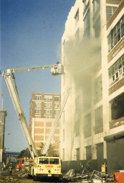 Looking south on Front Street from Market Street, this 1992 photo is of Camden Fire Department Ladder Company1 combating a fire on the 4th floor of the then vacant Campbell Soup plant. |
