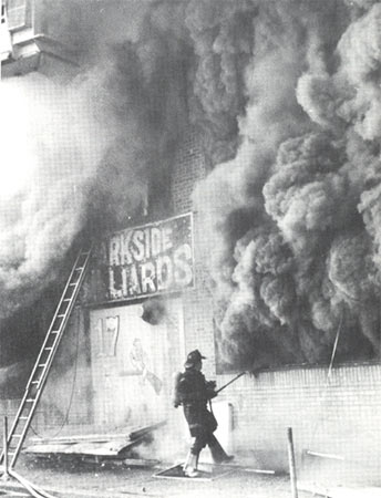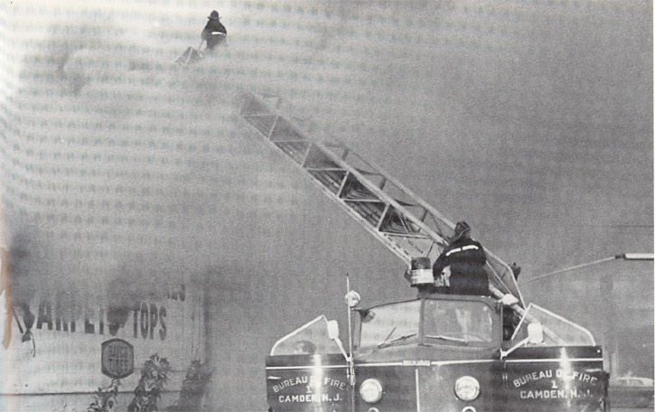 Haddon Avenue photographs by Bob Bartosz Parkside Billiards Fire fighter does effective job of venting front of pool hall as Ladder Company 1 gets into position above. This fire, on March 24, 1980, went to a Third Alarm with many special calls.