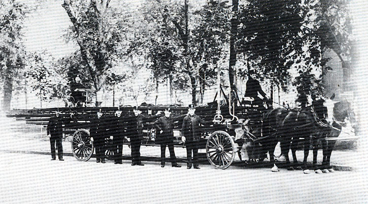 Ladder Company 1, 1908: Peter B. Carter, Captain; Peter S. Gray, Lieutenant; Harry Burrough, Tillerman; Steward Bakley, Driver; Howard Currie, Rollo Jones, Harvey Watts, Harry Green, and Edward Finley, Laddermen. One of the laddermen appear to have not been present when this photograph was taken, due to illness or vacation. |