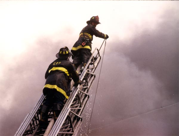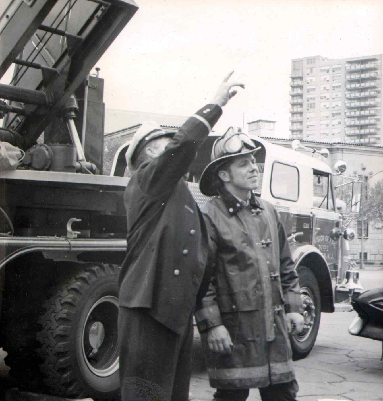 Training Battalion 1 Chief Allen F. Hess Sr. and Captain Richard Brooks of Ladder Company 1 discuss problem before laddering process began. |