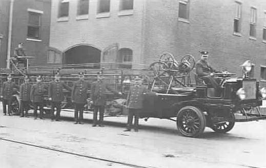 Ladder Company 1, February 1914: william h. tatem, Tillerman; Harry Burrough, Driver; Civilian is probably American LaFrance Salesman Clarence Stanford. |