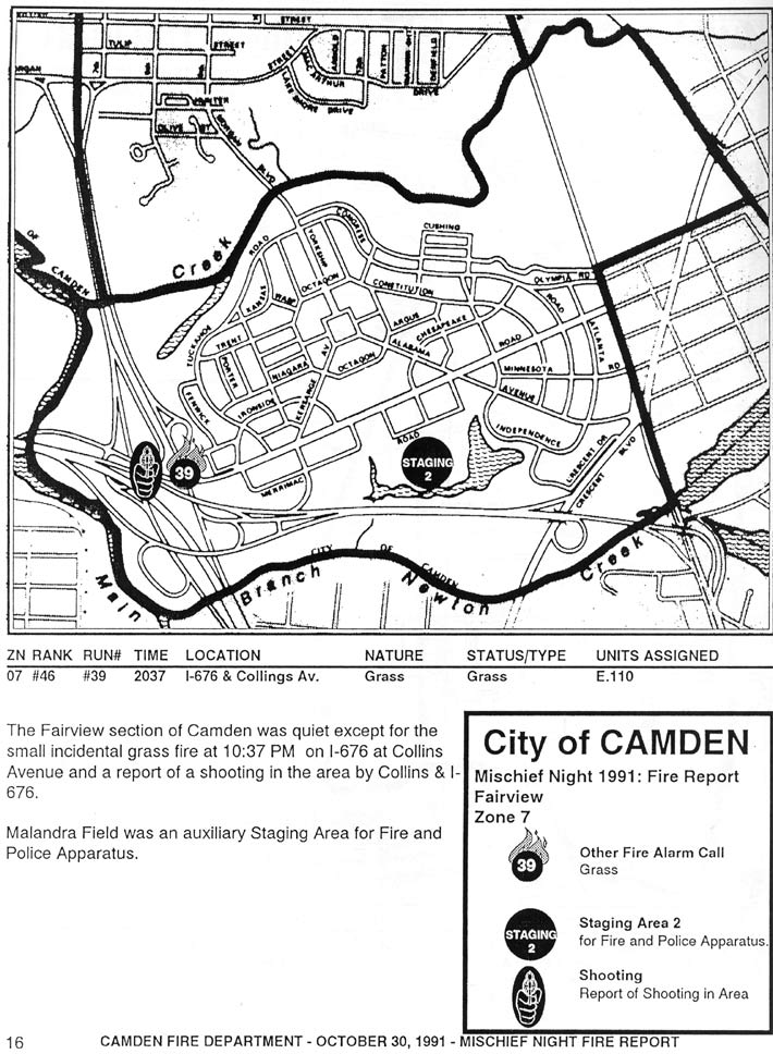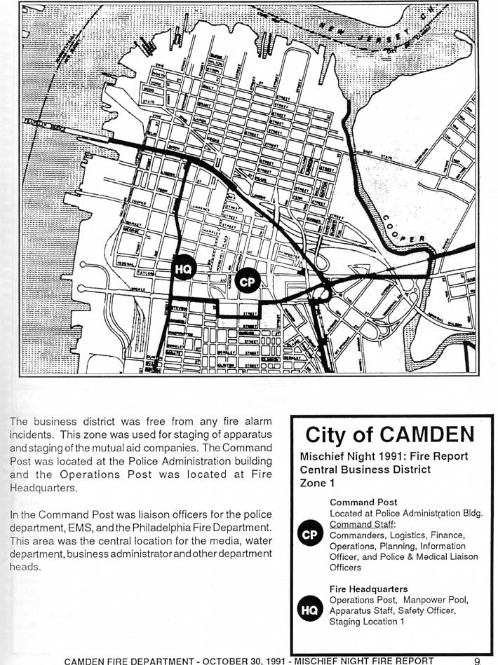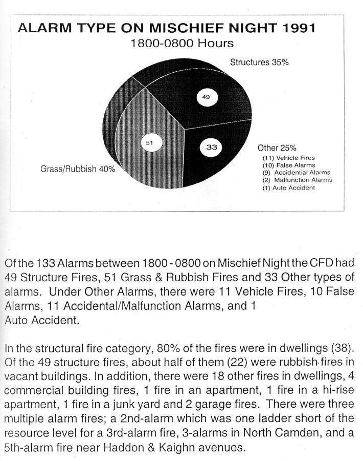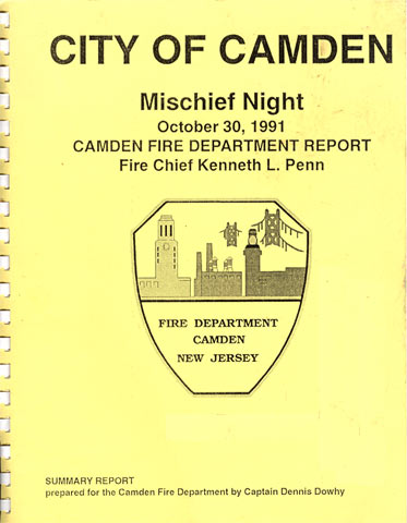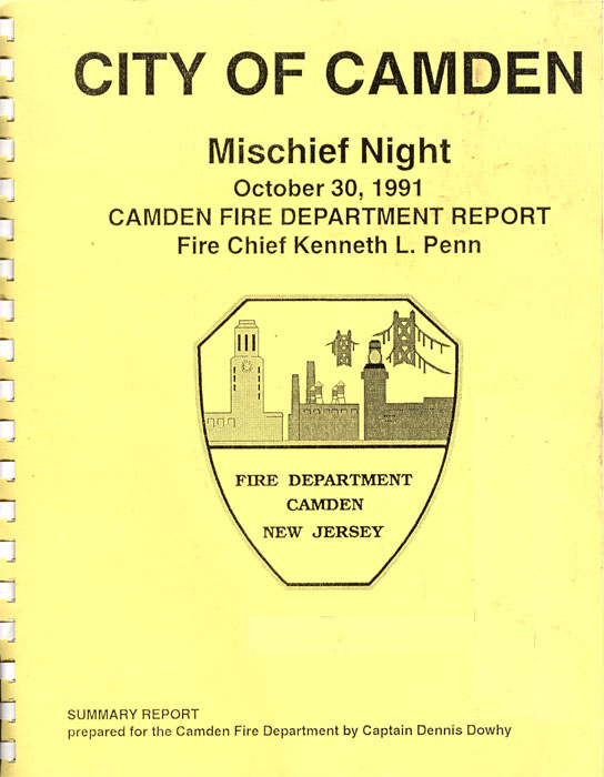 Open letter to all personnel involved with the CFD on Mischief Night 1991 In preparation for Mischief Night '91 incidents, my staff and I developed an operational plan in meetings with the Police Administration. In doing so, we Jcarnedthatthe Police Department entitled their operational plan "Operation Pride" for the period or October 30th, 1991. In terms of fire service planning, some of our staff at Fire Administration commented on the Police's optimism and more candidly termed last year's activities as "Operation Urban Storm." In reflecting on what we in the Fire Department were preparing, based upon our 1990 experience, I indeed felt that operation pride was less than appropriate. However, after witnessing firsthand the extraordinary performance of tile Camden Fire Department, Camden County, Burlington County, Gloucester County, and Philadelphia Fire Departments during the Mischief Night and Halloween, I feel what all Fire Fighters achieved was indeed operation pride of the highest order. In over 25 years of service to this Department, I have never been more gratified or so proud. Based on last year's operations in 1990, what we prepared for was a relatively similar experience. What occurred during Mischief Night '91 was the single busiest tour of duty in the 122 year history of the Camden Fire Department. Only the urban riots of the 1970's saw more overall fire activity over a period of several days but not in the short span of time that we incurred on the evening or October 30, 1991. Some 150+ alarms were serviced within a very brief period. What our Fire Control Force accomplished during that short time may never be surpassed. Our entire organization functioned like a fine-tuned machine from the top to the bottom, and may I say that it did not go unnoticed by the majority or other City Officials. From the administrative planning and preparation for the incident, to the magnificent execution by our units on the street, the Department performed nearly flawless. Since the nights of the extraordinary activity, my staff and I have met in an attempt to assess what worked well and in what areas improvement may be needed. There are several areas that we will administratively target in preparation for future operations. After meeting with the Chiefs, Company Officers and Fire Fighters who worked both nights I directed that a comprehensive report be developed. Your