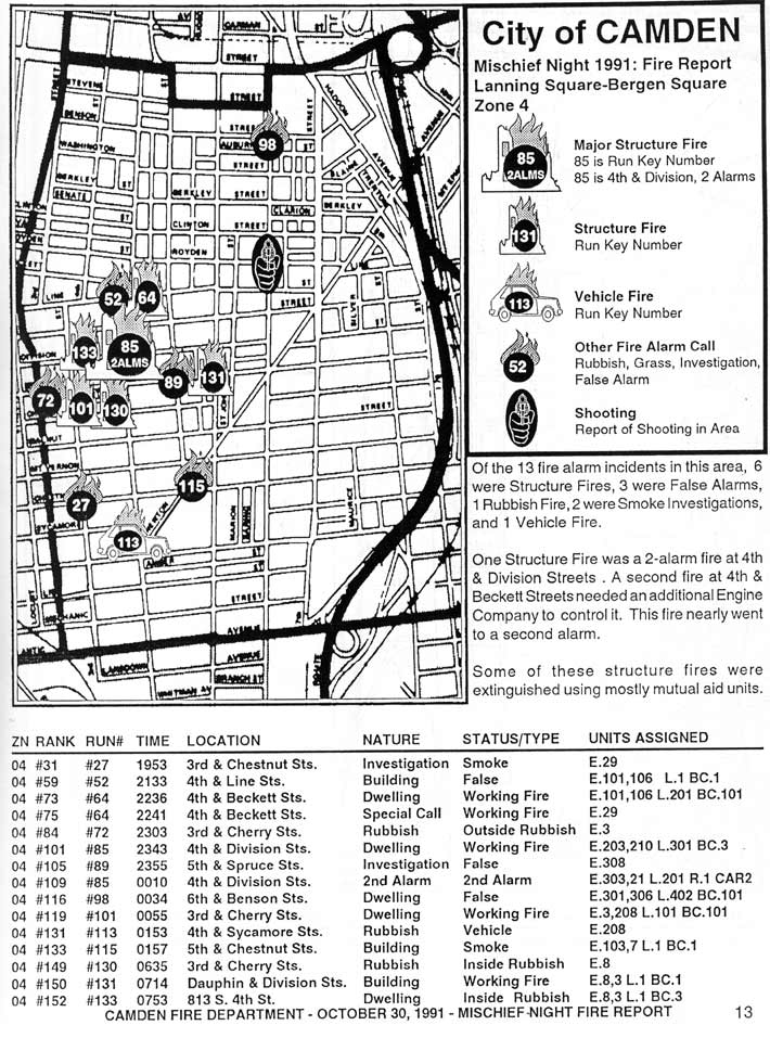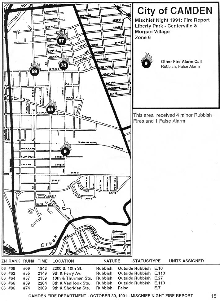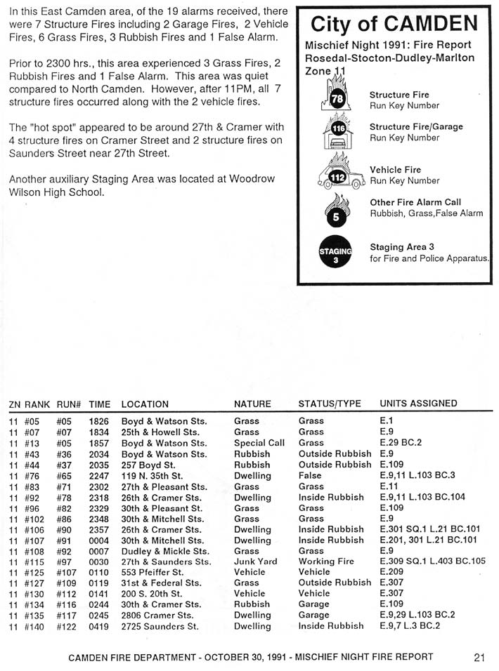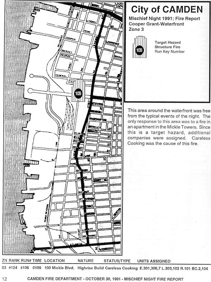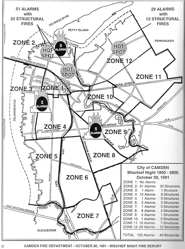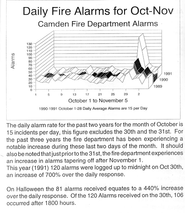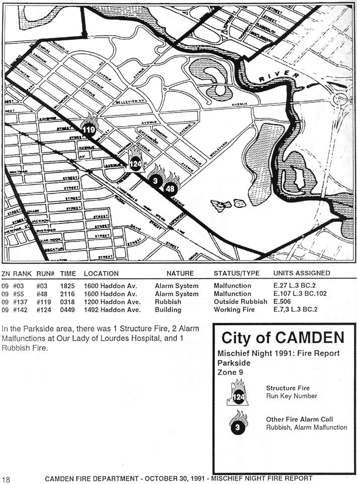 DEPARTMENT INTRODUCTION This report is divided into four sections. This section is an overview and includes the planning and implementation of Incident Command Operations. The second section graphically displays past trends of the Camden Fire Department (CFD) focusing upon mischief night. Included is a detailed analysis of each region (ZONE) of the City and the fire alarms that occurred on mischief night in that section. A look at Halloween is also evaluated and displayed. This section includes known drug distribution corners in which reported shooting incidents occurred. This section is critical for anticipating and planning for "Fire Storm 92". The third section is a report of the problems encountered during operations and the needs of the Department to properly prepare for "Fire Storm 92". The last section is a reference section of the alarms that occurred during this time period. Differences in the number of alarms is based on the time frame being analyzed. Mischief Night, for most of this report, is considered between 1800 hours October 30, to 0800 hours on Halloween morning, October 31. Halloween is analyzed from 0800 hours, October 31 to midnight 2400 hours. Some sections and charts include a 24 hour daily clock 0001-2400 for comparing past trends and anticipating 1992s mischief night problems. -; Numerous departmental reports were prepared and analyzed to develop this report. This report is the results of many fire fighters' and fire officers' dedicated work. To those who assisted in preparing this report and those who participated in controlling the incident, the Camden Fire Department is very grateful. Mischief Night, October 30, 1991, the City of Camden made international news on CNN. Top news was the burning of the city. The Fire Department anticipated a night similar to the year before with a slight increase in alarms. What occurred was a 96% increase in alarms over 1990. STANDARD OPERATING PROCEDURES A typical response pattern to a structure fire consists on two engine companies, one ladder company, one rescue company and a battalion chief. Each addition alarm receives the same complement except for the rescue. A target hazard assignment receives an additional engine, ladder, and battalion chief. During reported structural fires at night, an additional engine is assigned. On Mischief Night this response remained the same except the extra night time engine company would not be assigned. The rescue would respond if special-called by the chief, if "people trapped" were reported, or if the alarm was a target hazard. The CFD has 8 Engines Companies, 3 Ladder Companies, 3 Battalion Chiefs and 1 Rescue Company. This complement of equipment can handle three i-Alarm dwelling fires and two minor fires at one time. The CFD has five reserve apparatus that could be placed in service by augmenting overtime personnel. Any additional manpower and equipment is supplied by mutual-aid companies within the County. , In anticipating similar levels of activity to that which occurred during Mischief Night 1990, the CFD placed 3 reserve engine companies, 1 reserve ladder company, 1 manpower squad company, and a battalion chief in service staffed with overtime personnel. Mutual aid companies were placed on alert. The complete 100 series mutual aid roster was activated. For each CFD company there is an assigned mutual-aid company to cover when that CFD unit is committed to service. Two staging areas were assigned; one was near the Collingswood Fire Station, and the other at Delaware Gardens Fire Station. In these staging areas there were a total of 8 engine companies, 3 ladder companies and a rescue company, comprising the 100 Series Mutual-Aid Units. A major problem facing the CFD, was the fact that there were between 12 and 15 structure-fires occurring at the same time in different locations within the City. Around midnight, there were 12 separate fires occurring with reports still coming in of additional structure fires. By midnight, the previous fifth and second alarm fires were still not under control. Water pressure was low so the Water Tanker Task Force was activated. On Mischief Night 1991, the 100, 200, 300, 400, and 500 Series. Units were activated. In addition, four CFD Battalion Chiefs, a Water Tanker Task Force (4-tankers), a Heavy Hose Task Force (6-companies), and two Philadelphia Fire Department (PFD) Task Forces (6-Engines, 2-Ladders, and 2-Battalion Chiefs) were activated and responded. Mutual Aid services from the County of Camden, Burlington, Gloucester and Philadelphia extensively augmented the CFD fire control force in extinguishing the numerous fires that occurred, and provided coverage for maintaining continuity in fire protection. To handle the 133 alarms, the Camden County Communications Center assigned 204 Engine Companies, 65 Ladder Companies, 62 Battalion Chiefs, 7 Rescue Companies, and 6 Squad Companies. Each CFD Engine and Truck Company averaged about 7 laborious hours of intensive fire fighting throughout the night. |