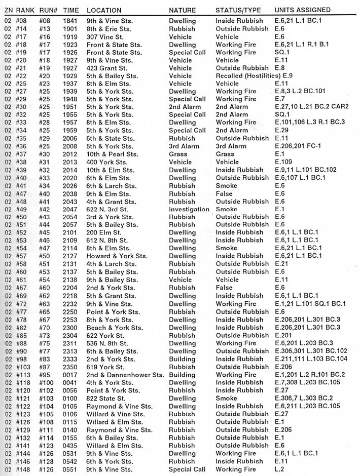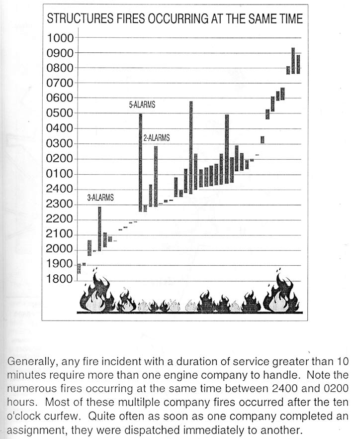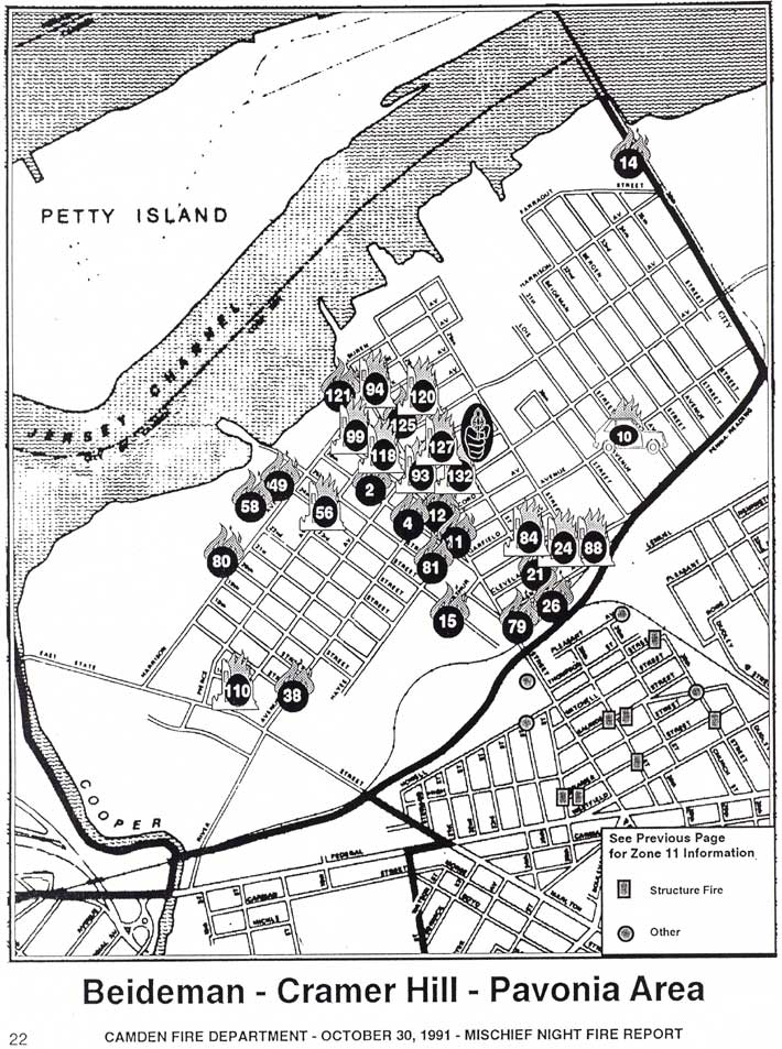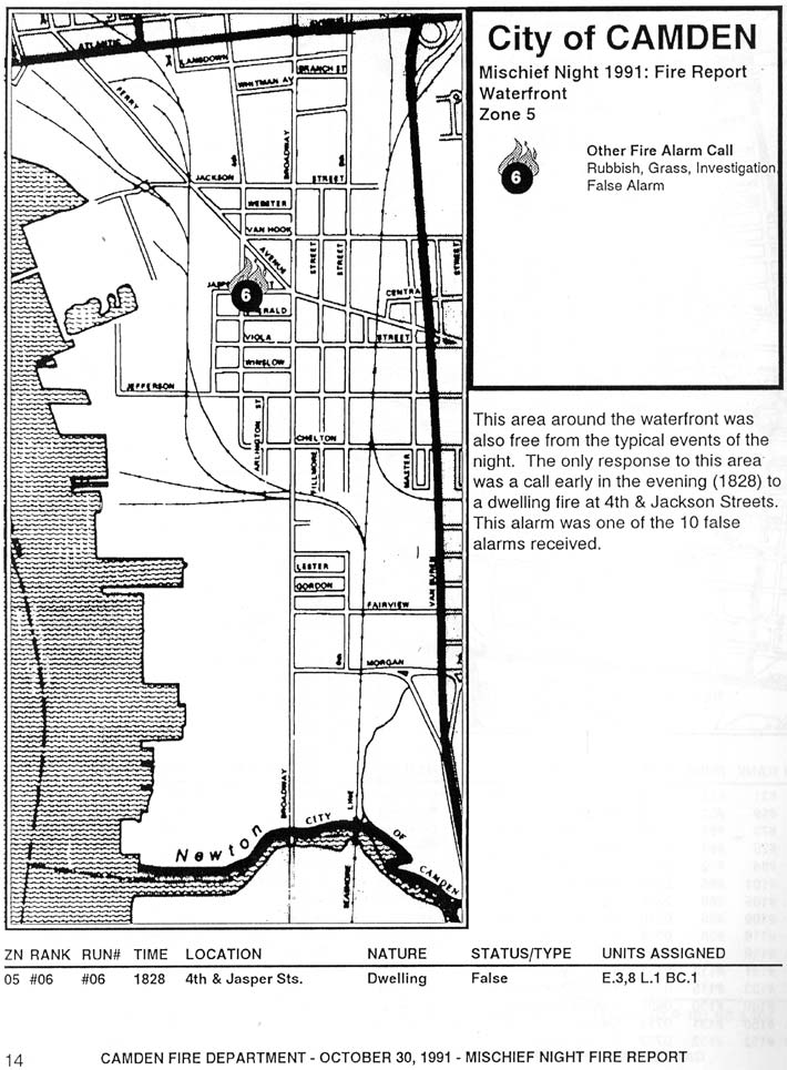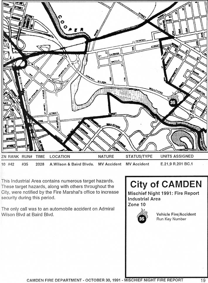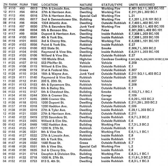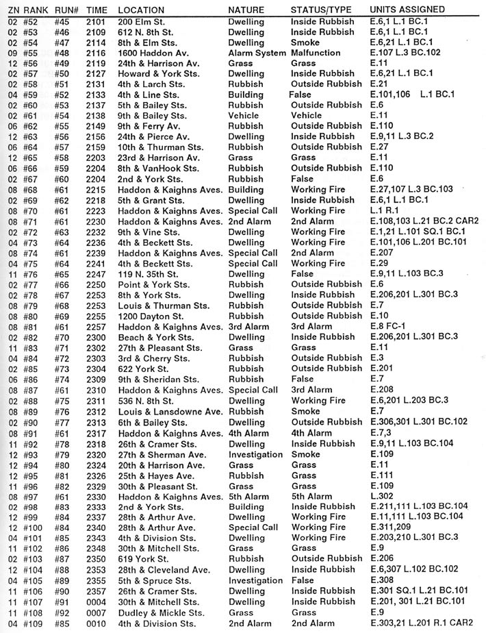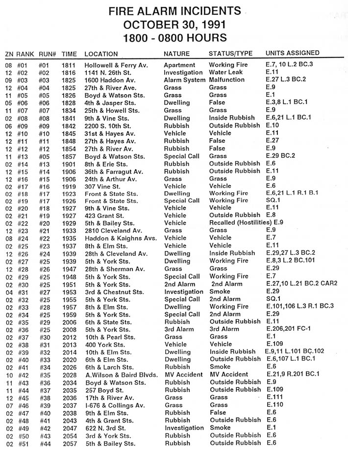 DEPARTMENT INTRODUCTION This report is divided into four sections. This section is an overview and includes the planning and implementation of Incident Command Operations. The second section graphically displays past trends of the Camden Fire Department (CFD) focusing upon mischief night. Included is a detailed analysis of each region (ZONE) of the City and the fire alarms that occurred on mischief night in that section. A look at Halloween is also evaluated and displayed. This section includes known drug distribution corners in which reported shooting incidents occurred. This section is critical for anticipating and planning for "Fire Storm 92". The third section is a report of the problems encountered during operations and the needs of the Department to properly prepare for "Fire Storm 92". The last section is a reference section of the alarms that occurred during this time period. Differences in the number of alarms is based on the time frame being analyzed. Mischief Night, for most of this report, is considered between 1800 hours October 30, to 0800 hours on Halloween morning, October 31. Halloween is analyzed from 0800 hours, October 31 to midnight 2400 hours. Some sections and charts include a 24 hour daily clock 0001-2400 for comparing past trends and anticipating 1992s mischief night problems. -; Numerous departmental reports were prepared and analyzed to develop this report. This report is the results of many fire fighters' and fire officers' dedicated work. To those who assisted in preparing this report and those who participated in controlling the incident, the Camden Fire Department is very grateful. Mischief Night, October 30, 1991, the City of Camden made international news on CNN. Top news was the burning of the city. The Fire Department anticipated a night similar to the year before with a slight increase in alarms. What occurred was a 96% increase in alarms over 1990. STANDARD OPERATING PROCEDURES A typical response pattern to a structure fire consists on two engine companies, one ladder company, one rescue company and a battalion chief. Each addition alarm receives the same complement except for the rescue. A target hazard assignment receives an additional engine, ladder, and battalion chief. During reported structural fires at night, an additional engine is assigned. On Mischief Night this response remained the same except the extra night time engine company would not be assigned. The rescue would respond if special-called by the chief, if "people trapped" were reported, or if the alarm was a target hazard. The CFD has 8 Engines Companies, 3 Ladder Companies, 3 Battalion Chiefs and 1 Rescue Company. This complement of equipment can handle three i-Alarm dwelling fires and two minor fires at one time. The CFD has five reserve apparatus that could be placed in service by augmenting overtime personnel. Any additional manpower and equipment is supplied by mutual-aid companies within the County. , In anticipating similar levels of activity to that which occurred during Mischief Night 1990, the CFD placed 3 reserve engine companies, 1 reserve ladder company, 1 manpower squad company, and a battalion chief in service staffed with overtime personnel. Mutual aid companies were placed on alert. The complete 100 series mutual aid roster was activated. For each CFD company there is an assigned mutual-aid company to cover when that CFD unit is committed to service. Two staging areas were assigned; one was near the Collingswood Fire Station, and the other at Delaware Gardens Fire Station. In these staging areas there were a total of 8 engine companies, 3 ladder companies and a rescue company, comprising the 100 Series Mutual-Aid Units. A major problem facing the CFD, was the fact that there were between 12 and 15 structure-fires occurring at the same time in different locations within the City. Around midnight, there were 12 separate fires occurring with reports still coming in of additional structure fires. By midnight, the previous fifth and second alarm fires were still not under control. Water pressure was low so the Water Tanker Task Force was activated. On Mischief Night 1991, the 100, 200, 300, 400, and 500 Series. Units were activated. In addition, four CFD Battalion Chiefs, a Water Tanker Task Force (4-tankers), a Heavy Hose Task Force (6-companies), and two Philadelphia Fire Department (PFD) Task Forces (6-Engines, 2-Ladders, and 2-Battalion Chiefs) were activated and responded. Mutual Aid services from the County of Camden, Burlington, Gloucester and Philadelphia extensively augmented the CFD fire control force in extinguishing the numerous fires that occurred, and provided coverage for maintaining continuity in fire protection. To handle the 133 alarms, the Camden County Communications Center assigned 204 Engine Companies, 65 Ladder Companies, 62 Battalion Chiefs, 7 Rescue Companies, and 6 Squad Companies. Each CFD Engine and Truck Company averaged about 7 laborious hours of intensive fire fighting throughout the night. |