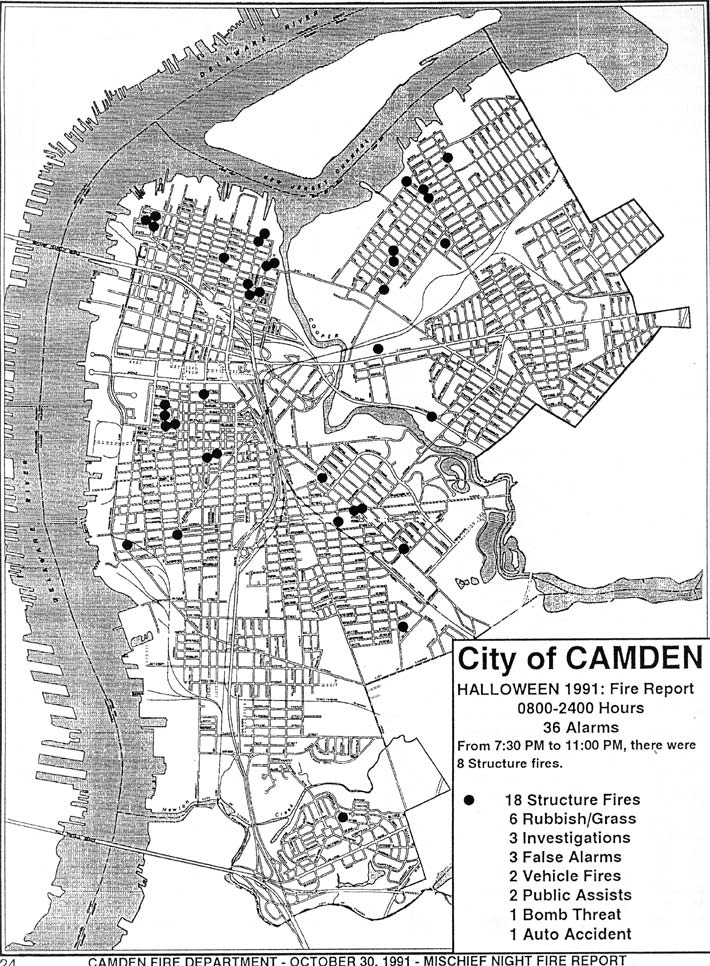 Another sad event in the City of Camden, the result of the delusion that perceived grievances and a sense of victimization are more important to the common good of a society than maintaining and when necessary enforcing standards of behavior and a sense of gratitude for the opportunity which this country gives and an obligation to serve one's community in time of peace or war, without thought of "what's in it for me". Perhaps the only bright spot of note in this event was the exemplary conduct of the City of Camden's Fire Department and its police officers on the street. To quote now-retired Dennis Dowhy, a Captain with the Camden Fire Department back in October of 1981: "There is a sense of pride that comes with this job, and no one can can rip it apart. A lot of us were born here in Camden. We think protecting the people is worthwhile." |