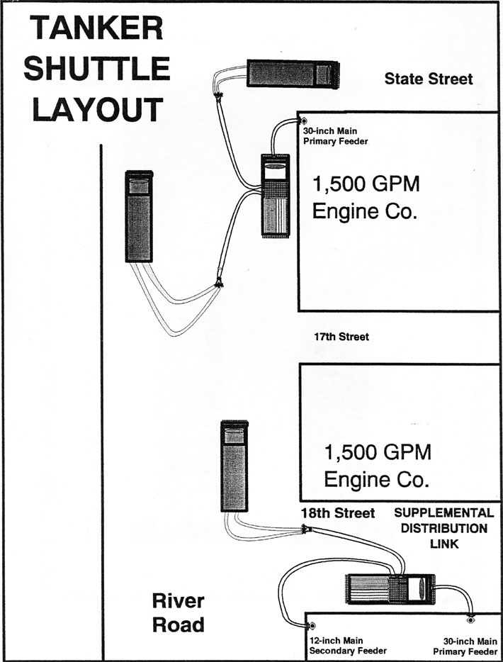 MISCHIEF NIGHT SOLUTIONS: Water Department: The Water Department agreed to have storage tanks full and increase the water pressure within the system to meet the high demand periods which may occur during the night. In addition, the Water Department has a staff of personnel available to assist the fire department in maintaining an adequate water supply. Fire Department: The first objective, increase and maintain the water flow to the existing water distribution system, should be adequate for most of the city by the above Water Department actions. However, an in-line booster pumping system should be in place when a "Working Fire" has been established in the Cramer Hill area. A pumping link between the 30 inch main on 18th Street and the 12 inch main located at River Road should supplement the grid system with both increase pressure and addition water flow in the direction of water flow usage. This link was established last year (1991) creating a 25 psig increase in water pressure and a noticeable increase in water flow on the fire grounds (approximately 1/2 mile away). At any "Working Fire" in Cramer Hill, or in East Camden, the Water Supply Officer and an 1,500 GPM Engine Company should be dispatched to 18th & River Road. Such proactive action will "booster" the pressure in the system, provide an increase in water flow, maintain existing pressure in the surrounding areas, and provide a tanker shuttle filling location when the TTF is activated. The second objective, provide the Incident Commander with a 1,000 GPM minimum supply of water, can be accomplished by activating the TTF early when water problems arise. The TTF should be automatically activated on a second alarm or greater in the Cramer Hill area. The TTF should be activated early because of "lead-time" required in set-up. Resources: