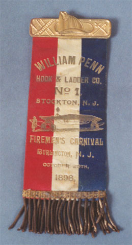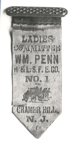 The ribbon on the left was worn by William Penn members to a Firemen's Carnival held in Burlingtonon October 20, 1898. The ribbon on the right was worn by members of the Ladies Committe tduring the late 1890s. The "Cramer Hill" location is worth noting, as the William Penn fire house was (and still is) located southwest of the railroad tracks, as is the actual "Hill", peaking at 30th & Saunders Streets. Click on Images for Enlarged Views
