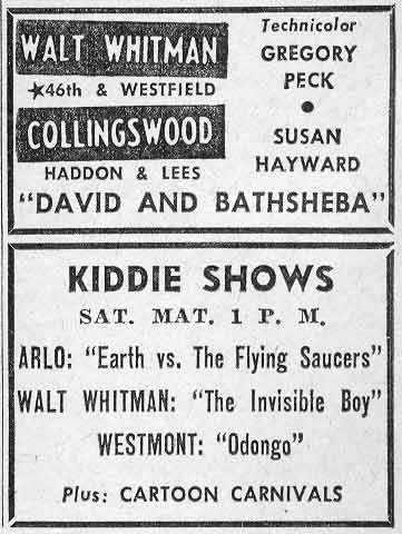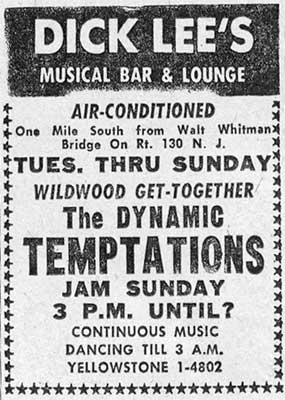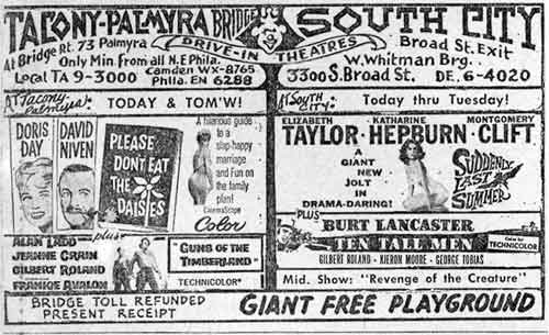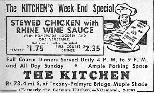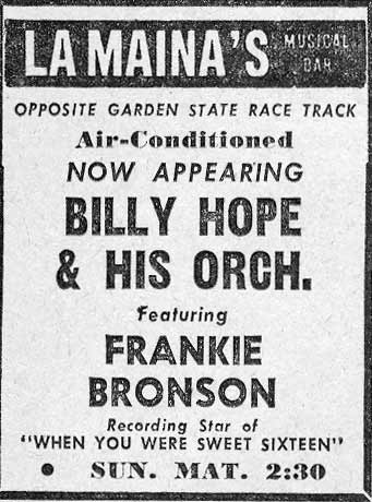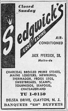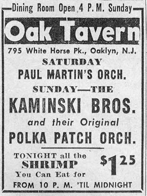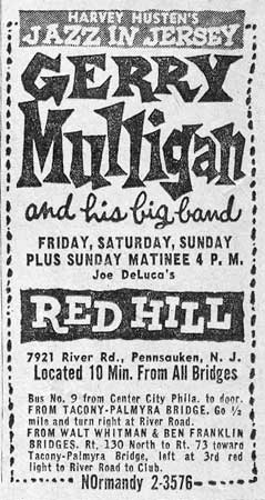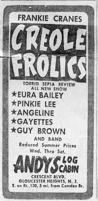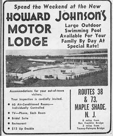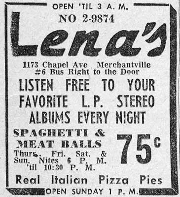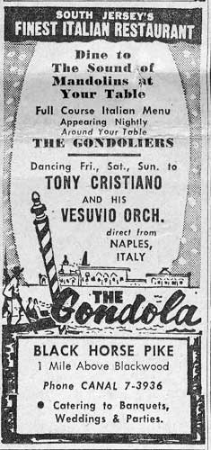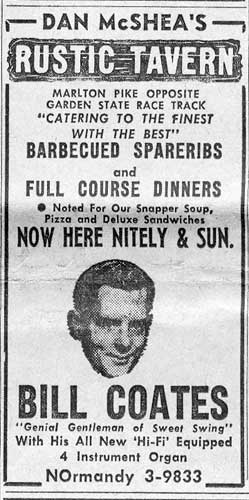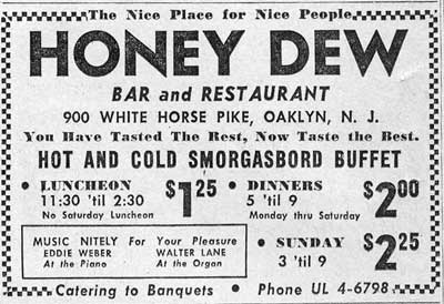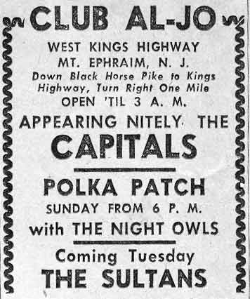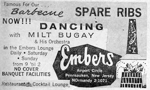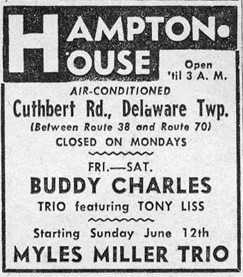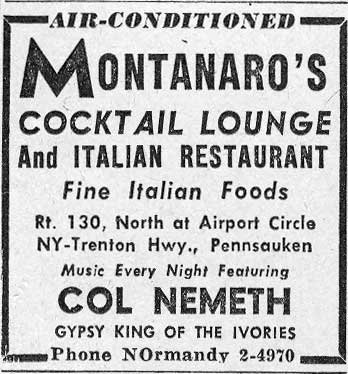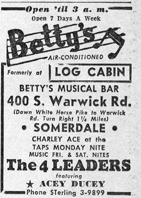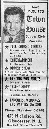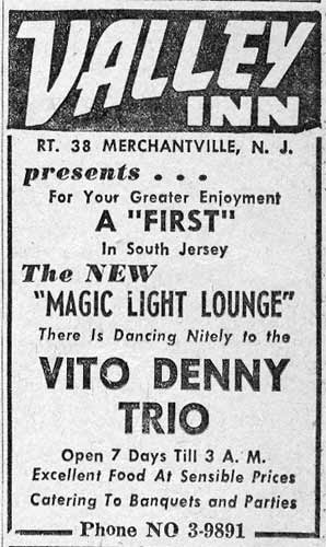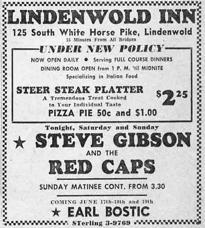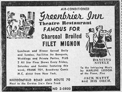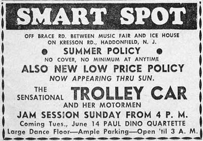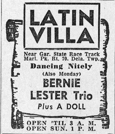 As time passed and the the suburban towns evolved, more and more business opened to cater to the recreational desires of those folks who had moved tot he suburbs. The opening of the Garden State Race Track in Delaware Township (present-day Cherry Hill) in the 1940s created a market along what is now Route 70 and Route 38. Other business opened up in the region. Some were new establishments, others had roots going back many years. Today most of the business that will be mentioned below are long gone, but I know that for those who visit this page, those names and the images accompanying them will bring happy memories. I would very much like to find out and post some information and photos of some of some of the live acts advertised below. Some of course are relatively famous… Gerry Mulligan, Earl Bostic, and Steve Gibson & the Red Caps for example. Then there are some less well known today… after all, who wouldn't want to know about "The Senstional Trolley Car and her Motormen", "The 3 Leaders featuring Acey Ducey", and "Johnny B. and the Rock-a-Bops"? If you have any information on some of these acts, please contact me by e-mail. As always, HAVE FUN!! Phil