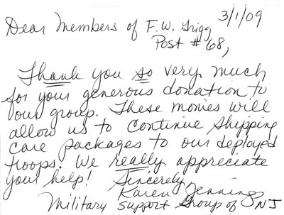 A motion was passed at the February meeting to send a check to the PFC Giordano Detachment, Military Support Group of New Jersey to help cover the cost of mailing packages to our deployed troops in the Middle East. The Post received the following letter of thanks from Karen Jennings, who coordinates the group's package program.