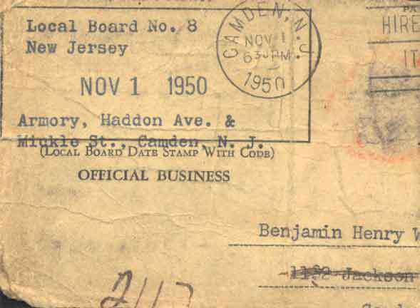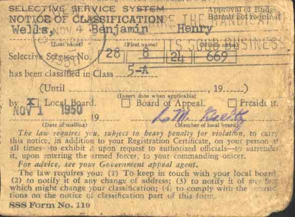Even after the war, Benjamin Wells still had to carry a draft card |