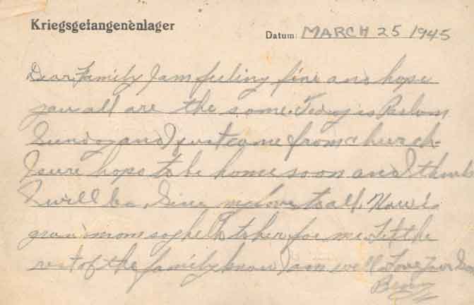 | ABOVE- Letter home, written from the Stalag Luft IVB, dated March 25, 1945 | |