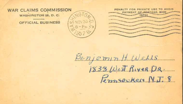 Benjamin H. Wells was born October 25,1924 in Camden, NJ to James and Hazel Wells. He attended school in Camden, NJ. His father was in the plumbing and heating business. Benjamin left of school after the eighth grade and apprenticed to his father’s plumbing business, and took vocational courses at night. |