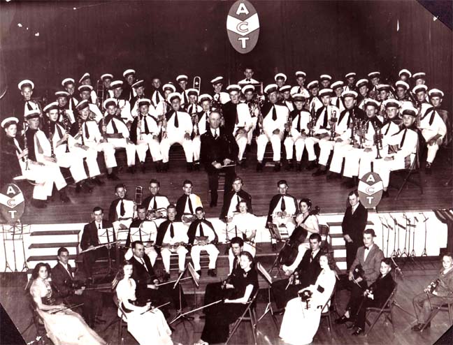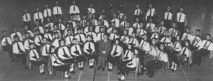 I left the army in March 1946. I immediately I took over the West Canadian Collieries Band of which I was the leader before enlisting and put in rehearsal music and ideas brought back from my experiences in show business. The concerts were a success. Everyone who attended claimed they were the finest they had seen. But they were not to last. By mid summer I began to think of a future for myself and Maple Leaf and the Crows Nest Pass did not figure well for the life of a music teacher. Mines had already been shut down, more were to follow, and the prosperity brought on by the war was on the wane. The answer to my search for something substantial came in the form of an article in the Lethbridge Herald. It read, "Wanted, a music teacher to form and conduct a band comprised of young boys and girls in the city of Lethbridge. " The sponsor was the A.C.T. (Association of Canadian Travelers), an organization of traveling salesmen. I made contact by phone with a Mr. McKitrick, president of the organization, set up a date for a meeting between us, and the rest is history. I moved to Lethbridge in the summer of 46. My job ? To teach music, band music, to the young of Lethbridge. My contract was to charge the students two dollars a month for lessons and should my income not come to an agreed upon figure of two hundred dollars per month, the balance would be forthcoming from the ACT. In 1946, fresh out of the service, I considered this a whopping salary. Now that the ACT had a teacher and conductor, the next step was to procure some band instruments. These were purchased for a lump sum of five hundred dollars from the Canadian Government as war surplus. They were the instruments sent through the Red Cross to the German prisoners of war interned in the prisoner of war camp in Lethbridge. On first sight of the instruments, I saw a heap of brass, one instrument on top of another, in the center of a huge drill hall. Then, on close examination, I saw for the first time in my life an assemblage of musical instruments unlike anything I imagined. These, everything from an E-flat trumpet to the largest, a sousaphone, were of one design. All were constructed in sousaphone style. In other words, every instrument, be it trumpet, french horn, baritone, trombone and bass, were made circular, to fit over the shoulder of the player. Made in this fashion, it was possible to perform on the instrument with one hand and yet steer a bicycle with the other. Music in the German army was also a part of the blitzkrieg and had to be mobile. This assemblage of such odd looking instruments was beyond my comprehension. I needed help, and who to turn to but my father. Requesting that he come to Lethbridge to have a look, he did more than that - he packed up and also moved, to be my assistant. |