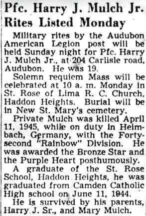 PRIVATE HARRY MULCH of Audubon NJ was born in 1925. He was a graduate of Camden Catholic High School in Camden NJ. He had entered the Army on June 24, 1944, and trained at Camp Wheeler GA. He was sent overseas on January 5, 1945. His death was reported in the April 4th edition of the Camden Courier-Post. |