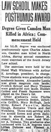 SO. JERSEY COLLEGE HAS MANY IN FORCES More than 15 percent of the graduates of the College of South Jersey are serving in some branch of Uncle Sam's military forces, it was announced today, by Dr. Charles A. Maurer, dean of the college. They are serving in the Army, Navy, Marines and in the Royal Canadian Air Force. A large number or the graduates hold commissions ranging from Navy ensigns and Army second lieutenants to Naval lieutenants senior grade and Army majors. Graduates of the college and the South Jersey Law School, who are in the Army Air Corps are Mair Auerbach, Earle Benton, Thomas F. Connery, Joseph Hilderbrand, David MacGhee and Robert W. Lowden. Serving In Army Serving in the Army are Philip W. Cooper, Joshua V. Davidov, William G. Freeman, Nelson G. French, Joseph Frost. Jack H. Fuhrman, John R. Hall, William B. Knight. W. Warren Luckenbill, Joseph Moss, Robert W. Norris, Ralph Obus, William Peel, John F. Rodgers, C. Zachary Seltzer and Robert T. White. Graduates in the Navy are John J. Crean, Angelo De Persia, Samuel T. French, Jr., Thomas B. Hazelton, Robert Hollingsworth, John H. Mohrfeld, Bernard W. Nicel. Frederick A. Smith and Fred Thatcher. Undergraduates serving in the Army are John Borden, William Boyd, Dominic De Persia, Elmer Highley, Frank Houser, William I. Johnston, Samuel Massimiano, James Matthews and Robert Runge. Those in the Navy are John Winton, Clyde Creato, William T. Hiering, John Heckers and Robert F. MiIler. In Canadian Force* Those with the Royal Canadian Air Force* are Leo Burnett, Robert Cundy, Charles Adamson, John Broomall, Ralph Corriden, Clark Fountain, Ben Hollick, Alfred Pierce, William Sippel and Richard Truette. Vincent J. Manno is now at an Army officers training school. *This appears to be in error. It does not appear that any of these men were serving in the Royal Canadian Air Force in July of 1942, rather, the all had enlisted in the U.S. Army Air Corps prior to the writing of this article. |