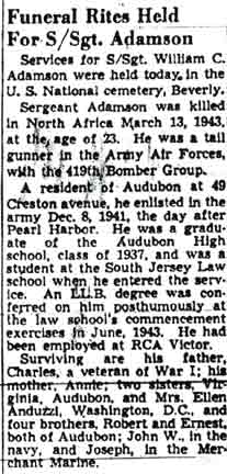 Staff Sergeant William Charles Adamson was killed in an accident while serving in North Africa on March 13, 1943, on a day when the 301st Bomb Group was attacking shipping in the Sicilian straights. He was survived by his father, sisters Ellen and Virginia, and brothers John W., serving in the Navy, Joseph, serving in the Merchant Marine, Robert, and Ernest. Joseph Adamson survived the sinking of the SS Patrick Hurley in September of 1942. The death of William Charles Adamson was reported in the April 6, 1943 edition of the Camden Courier-Post. On June 20, 1943 the South Jersey Law School in Camden conferred an honorary degree of LL.B. on Sergeant Adamson, at the annual commencement exercises. After the war ended, William Charles Adamson was brought home to New Jersey. His body was returned to the United States aboard the USAT Barney Kirschbaum in May of 1948, and he was buried at Beverly National Cemetery in Beverly NJ on June 4th of that year. His father passed away March 5, 1952, and was also buried at Beverly. Five members of Audubon High School's 1037 graduating class were also lost while serving in America's military during World War II. Besides Charles Adamson, the dead include Edwin Klenk, George Riggin, Charles Stevenson, and Peter Albano. |