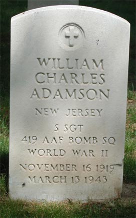 STAFF SERGEANT WILLIAM CHARLES ADAMSON was born on November 26, 1919 in Maryland to Charles and Isabel Adamson. Charles Adamson was a veteran of World War I. The Adamson family had previously lived in Washington DC where older sister Ellen was born in 1917. The family lived in New Jersey briefly in the 1920s before another move took them to Pennsylvania. The family moved to again, to 43 Lafayette Road, Audubon NJ early in 1930. The family later moved again to 49 Creston Road in Audubon. Charles Adamson operated a steamship ticket agency, the Camden Travel Service, at 211 North 6th Street in Camden NJ. He had served in the Army as a First Lieutenant during World War I, and was active in the American Legion. Known to friends and classmates by his middle name, William Charles Adamson graduated from Audubon High School in 1937, and completed a course at the South Jersey Law School, which became a part of Rutgers University's Camden campus years later. He was employed at the RCA factory in Camden prior to enlisting in the Army in December of 1941, after the Japanese attack on Pearl Harbor. Assigned to the 419th Bomber Squadron, 301st Bomb Group, he was trained as a tail-gunner on a B-17 bomber. His unit moved to England, in July and August of 1942, and assigned to the Eighth Air Force. They began combat in September of 1942 and attacked submarine pens, airfields, railroads, bridges, and other targets on the Continent, primarily in France. After eight missions, the group was re-assigned to the Twelfth Air Force after moving to North Africa in November, 1942. The 301st bombed docks, shipping facilities, airdromes, and railroad yards in Tunisia, Sicily, and Sardinia, and attacked enemy shipping between Tunisia and Sicily. During Sergeant Adamson's tine overseas, he flew out of the following airfields: