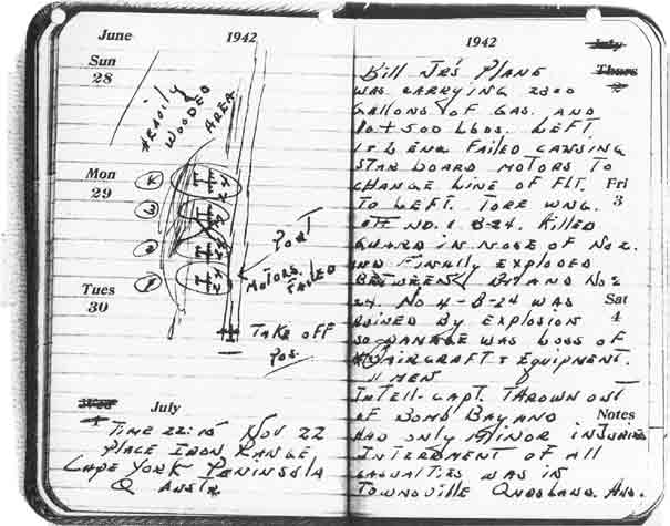 B-24 Liberator damaged during this accident at Gordon strip at Iron Range A USAAF B-24 Liberator piloted by Lt. Paul Larson of the 400th Squadron of the 90th Bombardment Group crashed during take-off for a bombing mission out of Iron Range's "Gordon" air strip. Aircraft of the 90th Bomb Group were taking off at night from Iron Range for their first bombing raid on Rabaul. The dust blown up by the first B-24's taking off obscured the dim airfield lights. The eleventh B-24 in line veered off the runway into two parked B-24 Liberators and a B-17 Flying Fortress. The B-24 caught fire and its bomb load exploded. Casualties were eleven US Service personnel killed and four aircraft. The remaining four aircraft did not take off. One of these #41-23765 was materially damaged while #41-23751, "Big Emma", was only slightly damaged. There were 7 aircraft from the 320th Squadron, 4 from the 319th Squadron and 4 from the 400th Squadron in this bombing mission. The first B-24, #41-11902 "Punjab", took off at 2300hrs as scheduled. The next B-24 did not take off until 2314hrs. There was a lot of confusion amongst the "green" pilots. Some of the pilots were not ready when it was their turn to take off. They had not determined a suitable method of communication and no method of control in despatching the aircraft was in place. The first aircraft took off with landing lights on while the others that followed did not use their landing lights. The runway lights were placed too far apart. That first B-24, #41-11902 "Punjab", vanished without a trace on this mission. It was piloted by the Commanding Officer of the 320th Squadron, Major Raymond S. Morse. Also on board was the Group Commander, Colonel Arthur W. Meehan, who was co-pilot. This loss in combination with the above crash caused some significant morale problems amongst the men of the 90th Bomb Group. One of those killed was a linemen sitting on the wing of an aircraft. There had been some speculation that there may have been up to 15 killed in this accident. The following burial records from the US Cemetery in Townsville show the names of the 11 men killed in this tragic accident:-