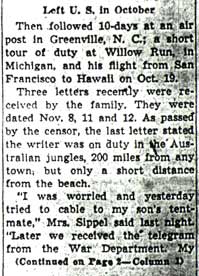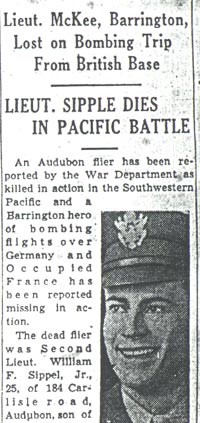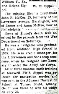 SECOND LIEUTENANT WILLIAM F. SIPPEL, JR. was born on January 22, 1917 in LaPorte IN to William F. and Helena M. Boehmer Sippel. In 1920 the family was still living in Indiana. By 1930 his family had moved to Audubon NJ, where his father was then working as a finisher in a piano business. Known to friends and family as Will, he grew up in Audubon. A 1935 graduate of Audubon High School, he studied law at the South Jersey Law School in Camden. William Sippel was working as the credit manager of the J. Eavenson Soap Company in Camden NJ prior to entering the Army in January of 1942. He qualified for flight duty, and trained as a four-engine bomber navigator. After basic training at Maxwell Field AL and advanced navigation school at Turner Field in Albany GA, he was commissioned as a Second Lieutenant on July 25, 1942. Lieutenant Sippel was assigned to the 400th Bomber Squadron, 90th Bomber Group, and went overseas in October of 1942, after a brief posting at Detroit MI. The 400th Bomber Squadron arrived with the rest of the 90th Bomb Group in Queensland, Australia in November of 1942, and reached their base at Gordon Air Strip, at Iron Range, near the top of Cape York Peninsula, on November 13. When they 400th arrived, the airstrips were unfinished and not sealed. Conditions were terrible, there were no barracks, and tents were pitched among the surrounding trees. Snakes, insects, and scorpions were in abundance. He had sent three letters home from Australia, on November 8, 11, and 12, 1942. The 400th Squadron's first mission was scheduled for November 16, 1942. On that day, Second Lieutenant William Sippel was killed when his plane crashed during takeoff. from Gordon Air Strip, iron range, Queensland, Australia. Click here for details of the events of that day. Will Sippel was survived by his parents, of 184 Carlisle Road, Audubon NJ, brother Matthew Sippel, and sister-in-law Kay. He was initially buried at the cemetery in Townsville, Australia. In 1946, his remains were removed to Hawaii, and he now rests at Gettysburg National Cemetery, Gettysburg PA. |