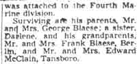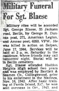 SERGEANT GEORGE BLAESE JR. was born in 1923 to George and Fannie Blaese. By 1930 George Blaese Sr. owned a home at 35 Jackson Road in Berlin NJ next door to his brother Frank Blaese, and. worked as a window glazier in a local lumber yard. Besides George Jr., there was a daughter Darlene Blaese. Before enlisting in the Marines, he worked for the Bartlett & Seaman Company in Collingswood NJ. George Blaese Jr. enlisted in the U.S. Marine Corps, November 16, 1942. He served in Company F, 24th Regt., 2nd Bn., 4th Division. and had been promoted to the rank of Sergeant when he was killed in action on Saipan, Marianas Islands, on June 17, 1944 and interred there. He had previously seen action in the Marshall Islands. He was awarded posthumously the Bronze Star Medal, on June 2, 1946, with the following Citation: �The President of the United States takes pride in presenting the BRONZE STAR MEDAL posthumously to SERGEANT GEORGE BLAESE, UNITED STATES MARINE CORPS RESERVE for service set forth in the following CITATION: �For heroic achievement as Squad Leader of a Rifle Platoon serving with the Second Battalion, twenty-fourth Marines, Fourth Marine Division, in action against enemy Japanese forces on Saipan, Marianas Islands, from 15 to 17 June 1944. When his squad was subjected to a fierce and accurate volley from an enemy fieldpiece at close range, Sergeant Blaese vigorously countered the hostile attack, fearlessly moving form man to man while directing their return fire. Mortally wounded in the performance of his hazardous task, Sergeant Blaese, by his zealous efforts and able leadership, rendered valuable service, which was in keeping with the highest traditions of the United States Naval Service. He gallantly gave his life for his country. For the President, James Forrestal, Secretary of the Navy George Blaese Jr. was brought home after the war. He was buried on June 19, 1948 at Berlin Cemetery in Berlin NJ. |