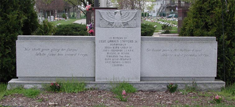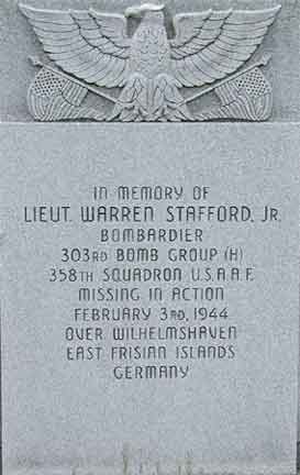 SECOND LIEUTENANT WARREN STAFFORD JR. was born in 1920 to Warren and Emma Stafford of Berlin NJ, His grandfather, Elmer Stafford, had been a bank president, and his father worked in the courthouse, first as a clerk, and later as a real estate agent. By 1930 the family was living on the White Horse Pike. Warren Stafford Jr. was a 1937 graduate of Haddon Heights (NJ) High School. He later attended the Pierce School in Philadelphia and the College of South Jersey Law School in Camden. He worked for the New York Shipbuilding Corporation in Camden NJ before enlisting into the Army Air Force. Warren Stafford Jr. was in his third year of college when he volunteered for service in January of 1942. He was rejected for being underweight by the Navy and the Coast Guard, but finally was accepted by the Air Forces as an Aviation Cadet. He enlisted in the United States Army at Nashville TN on October 27, 1942. He reported for active service at Trenton NJ, and later was stationed at Nashville TN, and Santa Ana CA, for pre-flight training, at Deming NM for bombardier training, Carlsbad NM for navigation, Coyote TX, Dalhart TX, and Kearney NE for crew training. He was commissioned as a 2nd Lieutenant on July 10, 1943 at Deming NM. Before going overseas, he was home on leave in October, 1943, he had also been home on furlough in December of 1942. Warren Stafford Jr. left Kearny Army Air Field, Kearny NE on December 16, 1943 by air for England by way of Newfoundland. With his crew he was assigned as a replacement to 358th Bomber Squadron (Heavy), 303rd Bomber Group, nicknamed �Hell�s Angels� of the 8th Air Force, stationed at Molesworth, near Kettering, England. On February 3rd, 1944 the 303rd Bomber Group marked its second year of service. Warren Stafford Jr. wrote a letter home before taking off on a mission. According to reports on that date, 600 bombers and accompanying fighters left on a mission to bomb the U-Boats and Naval Base at Wilhelmshaven, Germany. His entire B-17 Flying Fortress crew of ten men were reported missing in action over Germany on February 3rd, while returning from a successful mission to Wilhelmshaven. He was entitled to wear the American Defense Medal and European Theater Ribbons, and was awarded posthumously the Purple Heart. Warren Stafford Jr. was survived by his parents, of 333 Main Street, Berlin NJ. His father was the chairman of Berlin Draft Board No, 6 at the time of his son's death. Warren Stafford Jr. was one of six members of Haddon Heights High School's class of 1937 to lose their lives while serving in the United States armed forces during World War II, the others being William C. Tait, Edgar S. Crouthamel, William Raws, Oscar Kline, and Oliver F. Starr Jr.. Another member of the Class of 1939, Carlton R. Rouh, was awarded the Congressional Medal of Honor. |