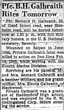 PRIVATE FIRST CLASS BERNARD H. GALBRAITH of Central avenue, in Blackwood, Gloucester Township NJ, had worked for the R.M. Hollingshead Corporation in Camden NJ prior to entering the United States Marine Corps. |
