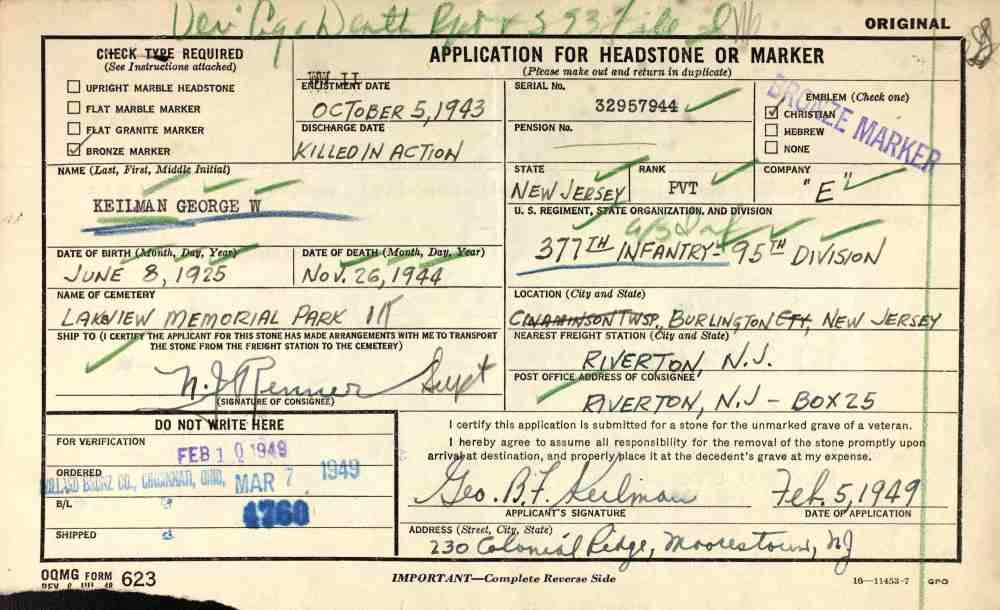 PRIVATE GEORGE WILLIAM KEILMAN was born in New Jersey on June 8, 1925 to George and Margaret Keilman. His father worked as a draftsman in a shipyard. In 1930 the family owned a home at 130 Pennsylvania Road in Brooklawn NJ. In 1933 the elder Keilman served as Police Recorder in Brooklawn. Private George Keilman graduated high school prior to being drafted. He was inducted into the United States Army on September 14, 1943 at Camden NJ. He died while serving America during World War II. A childhood friend, David Reich, thought that he was killed at Omaha Beach in June of 1944. This, however was not the case. Private Keilman was killed on November 26, 1944 as the 95th Division pushed towards the Saar River. George William Keilman was brought home and buried at Lakeview Memorial Park in Cinnaminson, New Jersey in 1949. |
