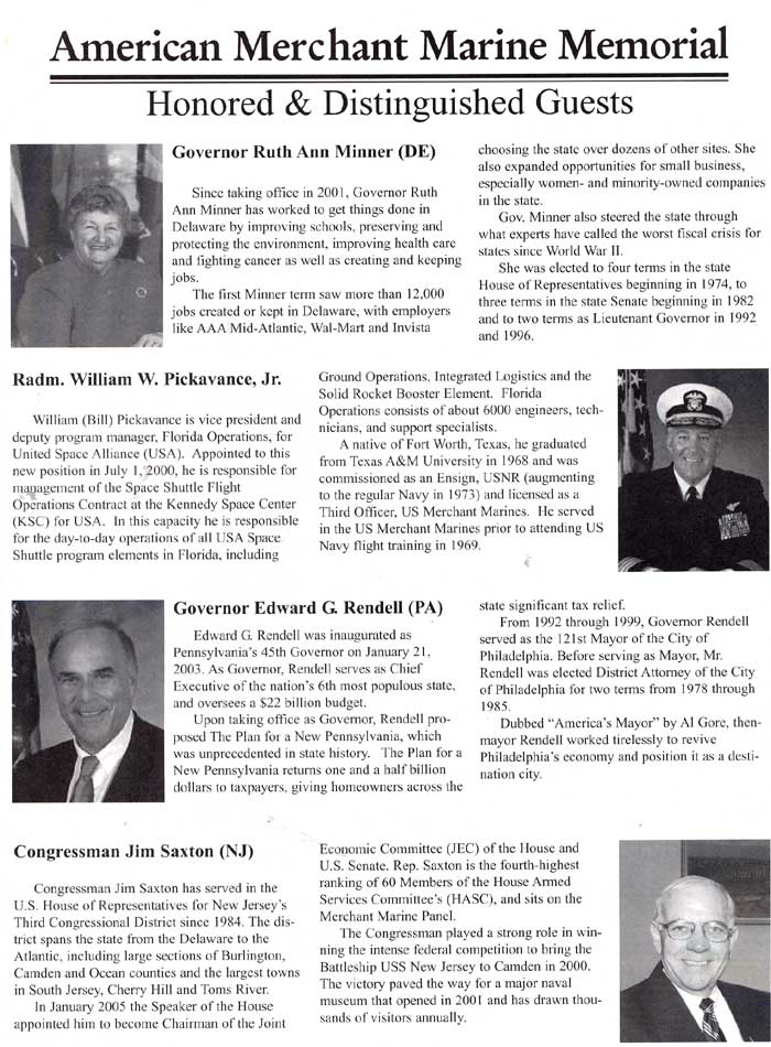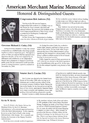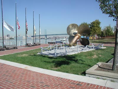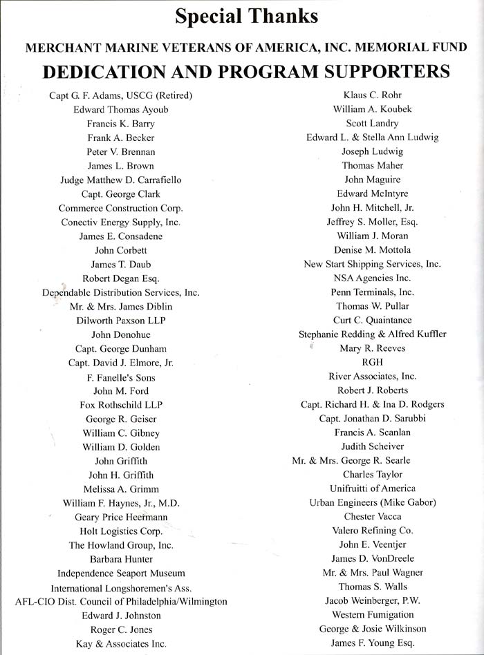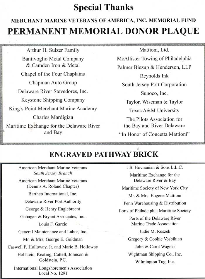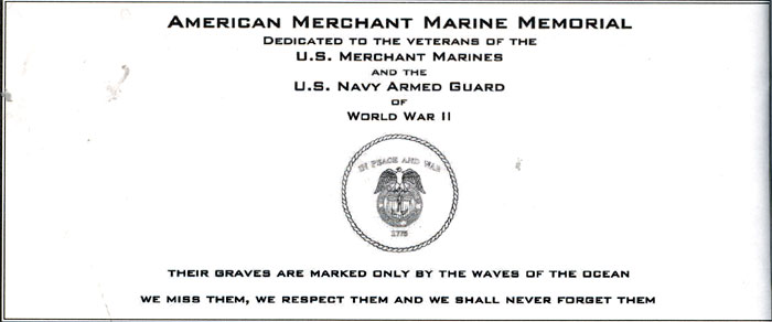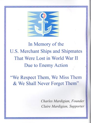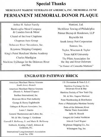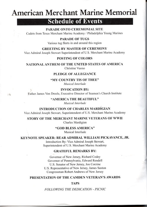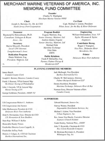 It must be a good is a if two people have it at the same time, and this is the case in relation to this page and the American Merchant Marine Memorial monument in Camden, New Jersey which was dedicated on June 11, 2005. I first put a page on the Internet as an on-line memorial to the men from Camden, New Jersey and other towns in Camden County who died while serving in America's Merchant Marine during World War II in late 2002, while Charles Mardigian got the ball rolling on having a physical monument placed on the Camden Waterfront around the same time. Neither of us were aware of the others efforts, and we first met by phone, through Joe Balzano of the South Jersey Port Corporation, in July of 2005. Click to the link below to find out more about the merchant marine and those from Camden and Camden County who made the ultimate sacrifice for us during World War II. September 17, 2005 |
