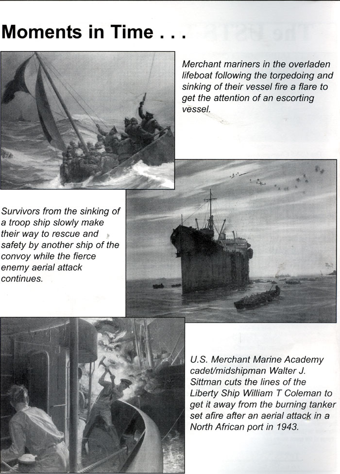 U.S. MERCHANT MARINE AND U.S. NAVY ARMED GUARD THE U.S. MERCHANT MARINE WAS A FLEET OF GOVERNMENT OWNED VESSELS OPERATED BY PRIVATE SHIPPING COMPANIES. THE MERCHANT MARINE WAS RESPONSIBLE FOR TRANSPORTING FULLY 85% OF THE TROOPS, AMMUNITION AND SUPPLIES USED TO SUPPORT THE ALLIED WAR £EFFORT DURING WORLD WAR II AND IS CREDITED WITH CONTRIBUTING DECISIVELY TO THE ULTIMATE ALLIED VICTORY, THE MERCHANT MARINE SUFFERED MORE LOSS OF LIFE. BY PERCENTAGE, THAN ANY BRANCH OF ARMED SERVICE. ONE IN 20 MARINERS SERVING ABOARD MERCHANT SHIPS IN WORLD WAR DIED IN THE LINE OF DUTY. THE MERCHANT MARINE: AND THE U.S. NAVY ARMED GUARD, WHICH MANNED THE GUNS ON MERCHANT SHIPS, ARE TRULY THE FORGOTTEN HEROES OF WORLD WAR II. THE MEN WHO SERVED THE WAR EFFORT WITH THE U.S. MERCHANT MARINE WERE ALL VOLUNTEERS RANGING IN AGE FROM 16 TO 78 YEARS OLD. NO ONE WAS DRAFTED INTO THE U.S. MARITIME SERVICE. MANY OF THE VOLUNTEERS WERE "UNFIT" FOR THE MILITARY DUE TO HEALTH OR DISABILITIES. THEY COULD HAVE STAYED HOME BUT WERE EAGER TO HELP WIN THE WAR AND CHOSE TO RISK THE PERILS-S OF THE SEA. MERCHANT SHIPS FACED DANGER FROM SUBMARINES.6URFACE SHIPS, AIRCRAFT, MINES AND THE ELEMENTS. IT IS ESTIMATED THAT OVER 9300 MARINERS WERE KILLED AND OVER 12,000 WERE WOUNDED. THE U.S. NAVY ARMED GUARD LOST OVER 2000 MEN. AND 1100 WERE WOUNDED. 600 MEN WERE CAPTURED AND HELD AS PRISONERS OF WAR. OVER 863 SHIPS WERE LOST DUE TO ENEMY ACTION, 31 SHIPS VANISHING WITHOUT A TRACE. MARINERS RECEIVED PAY ONLY WHILE SERVING ABOARD SHIP. IF A MARINER'S SHIP WAS SUNK, HIS PAY STOPPED AND HE: WAS RESPONSIBLE TO FIND HIS OWN WAY HOME AND AT HIS OWN EXPENSE. WHEN A MARINER RETURNED TO HIS HOME PORT, HE WAS OFTEN LOOKING FOR ANOTHER VESSEL TO GO BACK TO SEA, SOMETIMES ONLY TO LOSE ANOTHER SHIP. THESE PROFESSIONAL SAILORS NEVER LOST FAITH IN THEIR COUNTRY IN TIME OF WAR. THEIR EFFORTS CONTINUED AFTER THE SIGNING OF THE PEACE TREATY; THEY STAYED UNTIL ALL OF OUR TROOPS WERE SAFELY HOME. RETURNING MARINERS DID NOT RECEIVE PRIORITY FOR jWAR LOSS OR MEDICAL CARE FOR DISABILITIES. THEY WERE NOT ELIGIBLE FOR UNEMPLOYMENT COMPENSATION OR LOW-COST LOANS OR EDUCATION, HOMES OR SMALL BUSINESSES. THEY SUFFERED FINANCIAL REPERCUSSIONS FROM THIS LACK OF BENEFITS AND OPPORTUNITY ALL OF THEIR LIVES. THE U.S. GOVERNMENT FINALLY GRANTED VETERAN STATUS TO THE: MERCHANT MARINE IN 1988. |