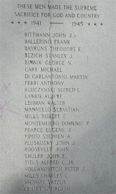 Three of the men listed on this memorial, Frank Ballerino, Michael Carr, and Michael Yachus (spelled Yatzus on the monument) died together when the troop transport HST Rohna was struck by a German guided glider bomb and sank of the coast of North Africa. Camden natives, Stephen V. Koscianski, Lewis Riondino, & Joseph H. Johnson also were lost that day, along with six other Camden County men, 19 year-old Harry V. Taylor Jr. of Haddonfield, William McKeon of Blackwood, Merl Reagle of Lindenwold, Carl Johanson and Joseph Kessler Jenkins of Pennsauken, and Elmer F. Day of Merchantville. In total, 1,015 men were lost, but the story was never told to the families or the general public for over 57 years due to wartime censorship. |