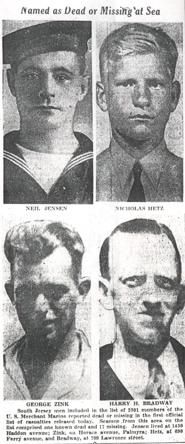 GLENN ROBERT CURTIS was born in Pennsylvania in 1924 to James and Nellie Curtis. The family moved top Oaklyn NJ, where by April of 1930, they were renting a home at 7 Valley Road. The elder Curtis was an electrician. Besides Glenn, there was an older sister, Dorothy, and a brother, Robert Curtis. The family later moved to the Woodcrest section of Delaware Township (Cherry Hill) NJ. Glenn Curtis shipped out as a messman in the Merchant Marine. He was aboard the Liberty Ship SS Meriwether Lewis when it was torpedoed in the North Atlantic. |