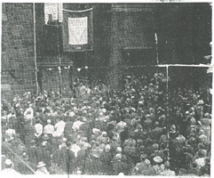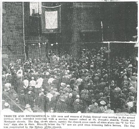 Service Flag Unfurled by St. Joseph’s Church at Impressive Rituals Sacrifices being made by Camden citizens of Polish descent were emphasized yesterday when a service flag was unfurled by St. Joseph’s Church, Tenth and Mechanic Streets, with 1150 men and women in the service being honored. A year ago a service flag with 450 stars was unveiled. Yesterday Mayor Brunner pinned gold stars on five mothers and one brother of men who had made the supreme sacrifice. Also honored was the mother of a seventh service man, a Japanese prisoner. Tears trickled down the cheeks of men, women, and children as the master of ceremonies, Adolph Kmiec, called the roll of six mothers and a brother. Four youths of the parish are known to have lost their lives; two are missing in action and another is a prisoner of the Japanese. The record reads: Sgt. Gustave Dziengowski, son of Mrs. Stella Dziengowski, 1476 Louis Street, killed in an airplane crash near White City KS, January 12, last. Pvt. Walter J. Koscianski, son of Mrs. Antonia Koscianski, of 966 Bulson Street, killed in action on February 6, last in North Africa and buried in Algiers. Pvt. John Lozowski, U.S. Marine Corps, son of Mr. and Mrs. George Lozowski, of 1143 Sheridan Street, killed in an airplane crash, marine Base, Atlantic Field NC, April 8, last. Staff Sgt. Roman Drapinski, brother of Adam Drapinski, of 1468 South 10th Street; died of injuries received in premature explosion of dynamite at Camp Campbell KS on July 18; father died of starvation after German invasion of Poland, mother somewhere in Europe, another brother prisoner of the Nazis. Joseph Piotrowski, U.S. Navy, Machinist Mate First Class, son of Mrs. Jessie Piotrowski, of 1343 Chase Street, survivor of Pearl Harbor attack by Japs. Listed as missing on the cruiser Helena in the Battle of Kula Gulf in July. Second Lieutenant Leopold Poduszczak, U.S. Air Corps; son of Mr. and Mrs. Boleslaw Poduszczak, 1105 Lowell Street, missing in action since July 26 when he participated in an air raid over Hanover, Germany. Lieutenant Bruno Ulak, son of Mr. and Mrs. Frank Ulak, of 914 Atlantic Avenue. Nothing is known of his whereabouts. He was taken prisoner by the Japs at Corregidor. Also honored by the mayor were mothers with four and five sons in the service. Congressman Wene, of the Second Congressional District, joined with the mayor in paying tribute to the war mothers. Wene spoke of the atrocities heaped upon Poland and its people when it was invaded by Hitler’s hordes four years ago next Wednesday. The flag made by the Sisters of the church, was unfurled between the church and the parochial school after a Solemn High Mass was celebrated in the church, which was crowded to the doors. Priests officiating at the mass were Rev. Leon S. Winowicz, Celebrant; Rev. Lawrence Faber, Deacon; Rev. Henry Blaszcynski, Sub-deacon; Rev. Aloysius Busch, Master of Ceremonies; Joseph Budniak, Thurifer. The sermon was preached by the Right Reverend Monsignor Strenski, pastor of the church. Monsignor Strenski also blessed the flag before it was raised by Private S. Szymanski. The choir sang the National Anthem before unfurling the flag. Fathers Winowicz and Faber assisted in the flag raising. One mother and a mother and father were called forward as being the parents of five sons in the services. One group included Joseph, Frank, Chester, Edward, and Walter, sons of Mrs. Frank Matyjasik, of 1407 South 10th Street. Another group comprised these sons of Mr. and Mrs. Anthony Matera: Chester, Edward, John, Joseph, and Sigmund. Four-star parents included Mrs. Mary Kopakowski, of 1452 Mount Ephraim Avenue: Edward, Raymond, Thomas, and William; Stanislaus and Angela Niedzwiecki, 1206 Morton Street: Joseph Edward Stanley, and John; Joseph and Sophia Kwoka, 1258 Mechanic Street: Frank, Walter, Stanley, and Edmond; Michael and Antonia Skedzielewski, of 1443 South 10th Street: Edmund, Michael, Karl, and Francis. Wojkowiak-Laskowski Post, American Legion color bearers, stood at attention throughout the exercises. Walter Uliase, attorney, recalled that a group of Polish citizens came to Camden about 70 years ago to found the present Polish colony. He said 20 years later they founded St. Joseph’s Church. He pointed out that the Poles had a free government before the Magna Carta and their original constitution was similar to the Four Freedoms enunciated by President Roosevelt and Prime Minister Churchill in their Atlantic meeting at the beginning of the war. Tribute to Parish Uliase paid tribute to the parish for its sacrifices to help win the war. He said one-tenth of the membership is in the armed forces and hundreds more have gone into civilian defense. He lauded the skilled mechanics of Polish descent who are working in Camden industries. He said they are doing everything possible to build ships and other equipment to beat the Axis. Mayor Brunner prayed for a free Poland. He said the Polish people are happy to think they have a God-given free country here. “The day of retribution is not far away,” the mayor declared. “The gangsters will have to pay for the suffering they brought upon the entire world. I feel proud as mayor of our Polish section of the city. It has always been peace loving. Your people are thrifty. They are buying their homes. They don’t buy war bonds and sell them. They struggle to keep up their payments.” “We are on our way to victory. We hope the job will be well done. Camden has a quota of $5,000,000 for the third war bond drive, which begins September 9. We are going to exceed that quota. It will be with the help of you men, women, and children buying binds and stamps to make sure that we bring about that victory for which we are hoping and praying.” “It will be four years next Wednesday 3when the world was startled and Poland momentarily stunned by the realization that an enemy who ever before the onslaught, posing as a friend, pounced upon a peaceful people with weapons and mi