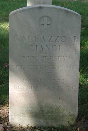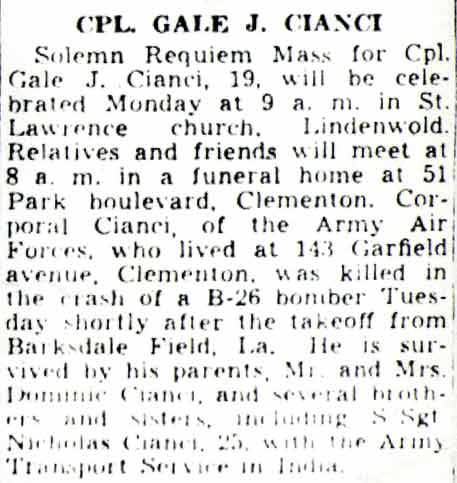 CORPORAL GALEAZZO J. CIANCI of Clementon NJ was born on May 10, 1925 to Mr. and Mrs. Dominic Cianci. He lived at 143 Garfield Ave in Clementon NJ. He enlisted in the United States Army, and had qualified for flight duty. Galeazzo Cianci was killed when the B-26 bomber he was in crashed shortly after take-off during a training flight originating from Barksdale Field LA on October 23, 1944. He was survived by his parents, and several brothers and sisters, including Staff Sergeant Nicholas Cianci, then serving with the Air Transport Command in India. Corporal Cianci's death was reported in the October 28, 1944 edition on the Camden Courier-Post. A mass was said for him at St Lawrence Church in Lindenwold NJ, and funeral services were held in Clementon. He was buried at Beverly National Cemetery in Beverly NJ on October 25, 1944. |