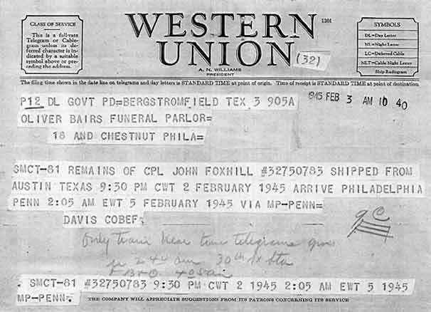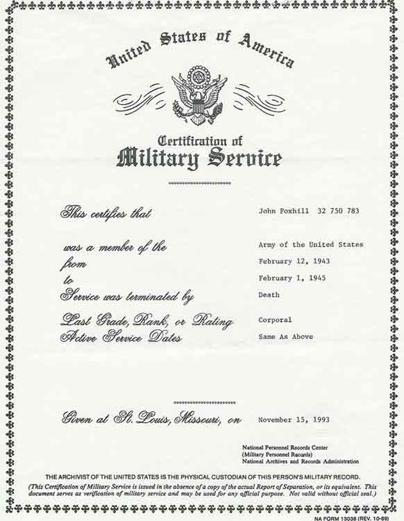 John Foxhill rests at Arlington Cemetery in Drexel Hill PA, next to his father, who passed away in 1946, and his mother who joined them in 1958. He is remembered on the Clementon NJ War Memorial. |