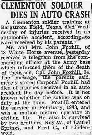 They were living at that address at the time of the April 1930 United States Census. John F. Foxhill Sr. had originally worked as a butcher. He apparently was a proficient piano player, and found work playing piano in theaters showing silent movies. By 1930 the elder Foxhill was working as a mechanic for the National Theater Supply Company, and also ran the projection machines when a record had to put on for sound to the films. Young John Foxhill was working as a motion picture projectionist in movie theaters in Camden, and also at the Jersey shore, serving as the projectionist at the Avalon Theater in Avalon NJ. He liked big cars and to drive fast. His niece remembers him commuting back and forth to the Jersey shore. He liked big cars and to drive fast. "Uncle John was a fast driver, pedal to the metal! I heard that he got from Clementon to Stone Harbor in 55 minutes once. Now this is by the back roads that are very curvy and two lane! I remember riding in the rumble seat of his car." His
