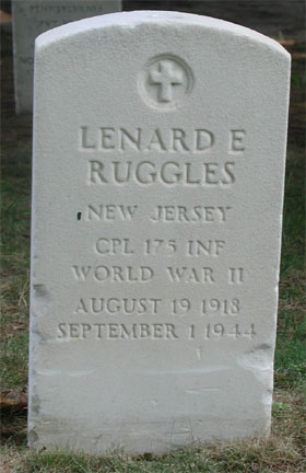 CORPORAL LENARD E. RUGGLES was born on August 19, 1918. He originally was from Clementon NJ. He was a graduate of Haddon Heights (NJ) High School. Prior to being inducted into the United States Army, he had married, and moved to Atlantic City NJ, where he was the assistant manager at an 5 & 10 cent store. After Lenard Ruggles was inducted into the Army, he was assigned to the 175th Infantry regiment, 29th Infantry Division. He landed on Omaha Beach on D-Day. He was killed in action on September 1, 1944. Lenard Ruggles was survived by his wife Esther, of Atlantic City NJ. He was brought home after the war. He was buried at Beverly National Cemetery in Beverly NJ on July 14, 1948. |