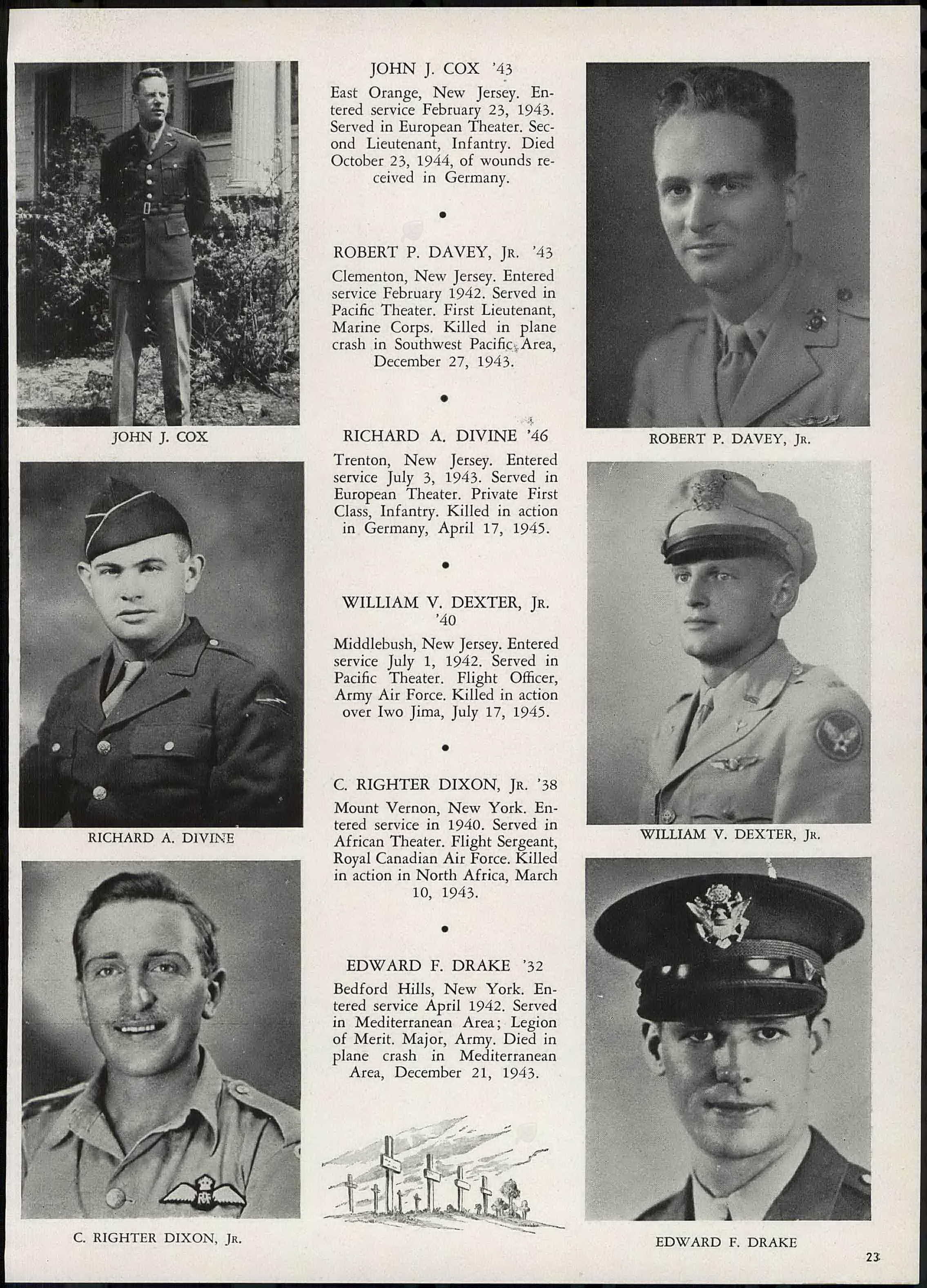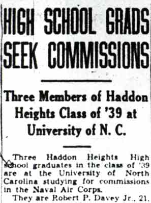 FIRST LIEUTENANT ROBERT PRESS DAVEY JR, was born on March 26, 1921 in Philadelphia PA, the first child of Dr. Robert P. and Sara Davey. His father was a dentist with a practice in Camden NJ. Dr. Davey served as the mayor of Clementon NJ in the late 1930s, and was at one time president of the Lower Camden County Board of Education. Robert Davey Jr.'s grandfather had been the mayor of Haddon Heights NJ early in the 20th century. Robert P. Davey Jr. grew up in Haddon Heights, where the family lived in 1930 at 203 Station Avenue, later moving to 229 Gibbsboro Road in Clementon. Robert P. Davey Jr. graduated from Haddon Heights High School in 1939, where he was a South Jersey interscholastic swimming champion while there. He entered Rutgers University in September of 1939, where he was a member of the Chi Phi fraternity, and was in his third year of schooling when he entered the nation's service in February of 1942. He had been a member of the school ROTC unit, but chose the Navy, where he was enrolled as a Marine air cadet. Robert Davey Jr. joined the Marine Corps, and qualified for flight school. He completed his pre-flight training in Chapel Hill NC in September of 1942, and was sent for his primary training at the Philadelphia Navy Yard. From there he went to Pensacola FL for his advanced training in December of `1942. He saw further duty at Barin Field AL, before being finally transferred to the Marine Corps base at El Centro CA, where he became a fighter pilot with 216th Marine Fighter Squadron, also known as VMF-216, flying the Chance-Vought F4U Corsair. Lieutenant Davey Jr. was killed when his plane was damaged by the enemy in Bougainville in the Solomon Islands. The damage caused him to veer off the runway and crash into a fuel truck, on December 27, 1943. He had written home shortly before his death, stating that he expected to get some leave time, and expressed the desire to visit Australia. He was survived by his parents, who by then had moved to 229 Gibbsboro Road in Clementon NJ, a brother, and a sister. |