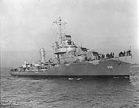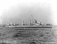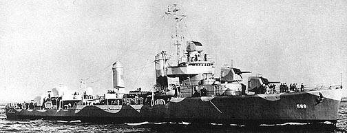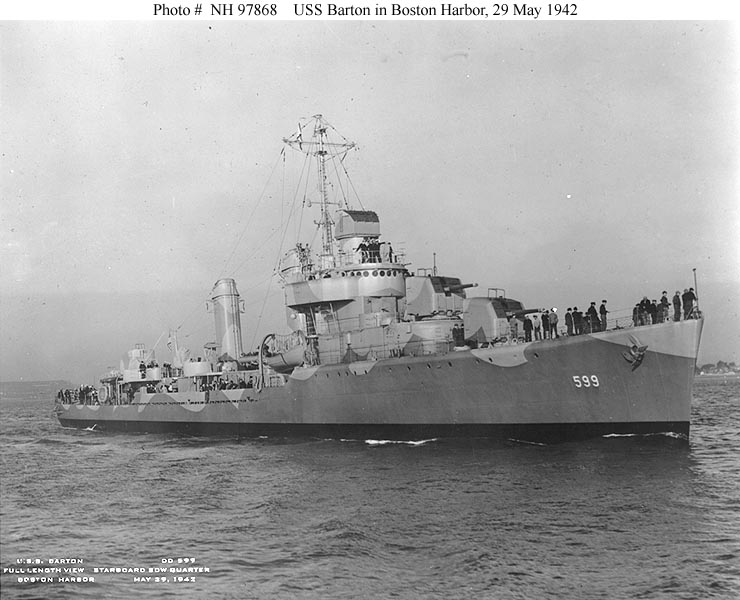 The first Barton (DD-599) was launched 31 January 1942 by Bethlehem Steel Co., Quincy, Mass.; sponsored by Miss Barbara Dean Barton, granddaughter of Admiral Barton; and commissioned 29 May 1942, Lieutenant Commander D. H. Fox in command. Barton departed the east coast 23 August 1942 and steamed to the Pacific, arriving at Tongatabu, Tonga Islands, 14 September 1942. During October she participated in the Buin-Faisi-Tonolai raid (5 October) and the Battle of Santa Cruz (26 October). On 29 October she successfully rescued 17 survivors of two downed air transports near Fabre Island. Against great odds on 13 November Barton, in company with Rear Admiral D. J. Callaghan's landing sup port group, took part in the Naval Battle of Guadalcanal. Barton commenced firing on the Japanese ships at approximately 0148. After launching four torpedoes she had to come to an emergency stop to avoid a collision. While she was practically dead in the water, two enemy torpedoes found their mark. The first torpedo struck her forward fireroom and, a few seconds later, a second torpedo struck her forward engine-room. Within seconds, Barton broke in two and sank, carrying with her an estimated 80 percent of her valiant crew. Forty-two survivors were rescued by Portland (CA-33) and Higgins boats from Guadalcanal. Barton received four battle stars for her service during October and November 1942. |