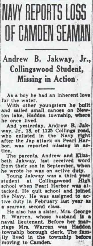 1942. On August 23, 1942 just before dawn in New York, destroyers USS Barton, USS Meade, and USS Nicholas hove to nearby the battleship USS Washington. The big ship lit off all its boilers at 4 a.m., called away sea and anchor details, and shifted colors at 6:15. The battleship set course 179T at 20 knots, headed for the Panama Canal…and the Pacific Ocean. When the Barton reached the Pacific, she became part of DESTROYER SQUADRON 12. Seaman Second Class Andrew Blair Jakway Jr. was killed in action on November 13, 1942 during the night naval battle for Guadalcanal, when the USS Barton (DD-599); Lt. Commander Douglas H. Fox, CO; took 2 torpedoes admidship, broke in two and sank immediately, losing 90 percent of her officers and crew. He was survived by his parents, Mr. and Mrs. Andrew Blair Jakway, Sr. of 1125 Collings Road, Camden NJ, and a sister, Florence, the wife of Lieutenant George Warren USN. She had worked as the borough clerk for Haddon Township NJ prior to the war. His death was reported in the February 3, 1943 edition of the Camden Courier-Post. |