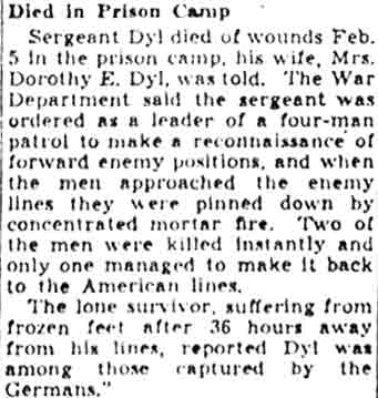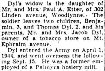 (Valeria), and Lodzio/Leokadia (Lillian). Andy By 1930 the Dyl family was operating a confectionary shop, and living at 1524 Mount Ephraim Avenue, in the heart of Camden's Polish community. Benjamin spent his early years in this Camden Neighborhood, where attended the Bonsall School, in the mostly Polish neighborhood neighborhood anchored by St. Joseph Catholic Church at 10th and Liberty Streets. The family later moved to Woodlynne, where he attended Collingswood High School, graduating in 1935. Benjamin took the commercial course while in High School. His yearbook noted "Baseball seems to wield a strange fascination over him", and he was on the high school golf team during his senior year. Benjamin Dyl found work in a hosiery mill in Palmyra NJ. He had married Dorothy Etter, also of Woodlynne, and the couple had two sons. Benjamin Dyl was inducted into the United States Army on April 1, 1944. After entering the Army in 1944, he trained at Camp Wheeler in Macon GA, and was sent overseas on September 15, 1944 as an infantry replacement. He was assigned to the 47th Infantry Regiment, 9th Infantry Division, joining the Division shortly after it took Saarlautern. In November and December the 9th Infantry Division held defensive positions from Monschau to Losheim. Moving north to Bergrath, Germany, it launched an attack toward the Roer, on December 10, taking Echtz and Schlich. From mid-December through January 1945, the Division held defensive positions from Kalterherberg to Elsenborn, Germany. In this time he was promoted from Private to Sergeant. During this period, Sergeant Dyl was wounded while on patrol, and was captured by German forces On January 15, 1945, Sergeant Dyl was ordered to lead a four man patrol to scout enemy positions. While approaching enemy lines, the patrol was pinned down by mortar fire. Two of the men were killed instantly, and Sergeant Dyl was wounded seriously enough to not be able to return to his own lines. The sole survivor, suffering from frozen feet after 36 hours out of doors, reported that Sergeant Dyl had been taken prisoner. Taken to a POW camp, Benjamin Dyl passed away on February 5th, 1945. Benjamin Dyl, the son of Jacob and Anna Dyl, was survived by his wife Dorothy Etter Dyl, and two sons, Benjamin, aged 2, and Thomas, 1. |
