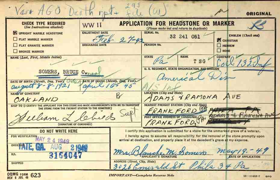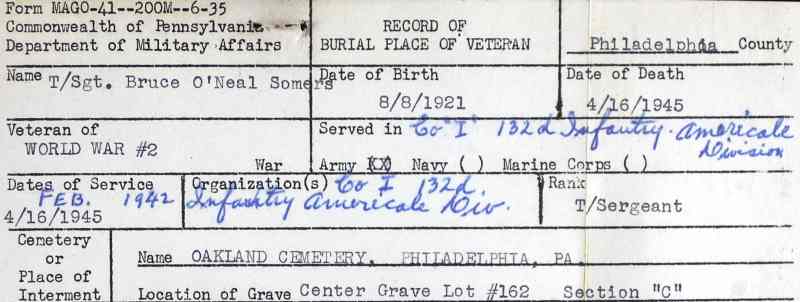 BRUCE O'NEAL SOMERS was born in Pennsylvania on August 8, 1921. He had completed four years of high school and was married when, on February 27, 1942 he was inducted into the United States Army at Camden NJ. Technical Sergeant Somers died of wounds received in combat on the island of Cebu in the Philippines on April 16, 1945. He was brought home after the war and was buried at Oakland Cemetery in Philadelphia, Pennsylvania. Bruce Somers is remembered on the Collingswood, New Jersey World War II war memorial. |
