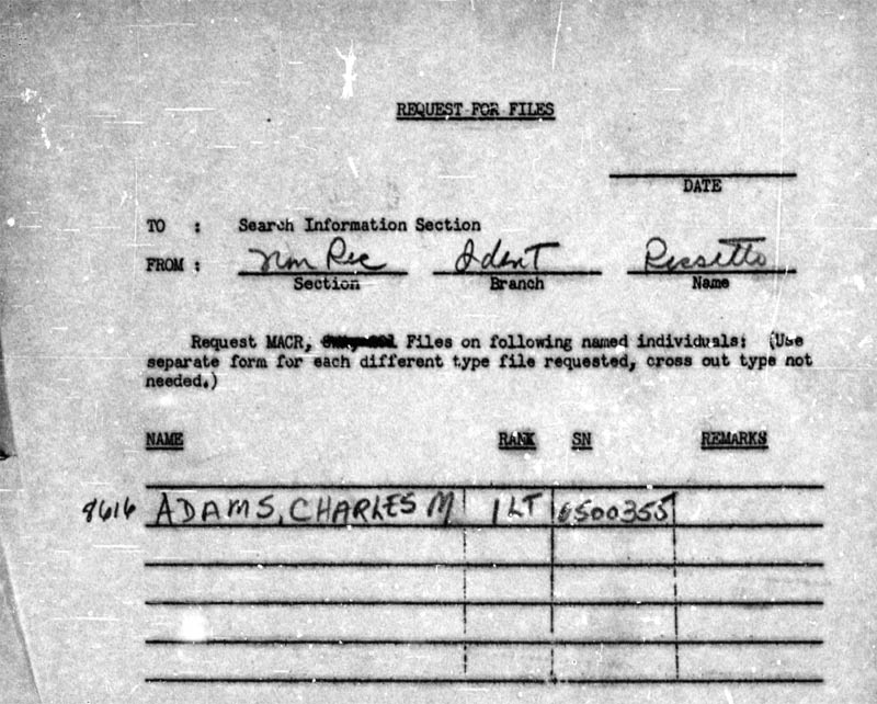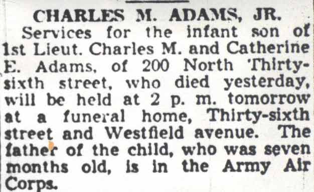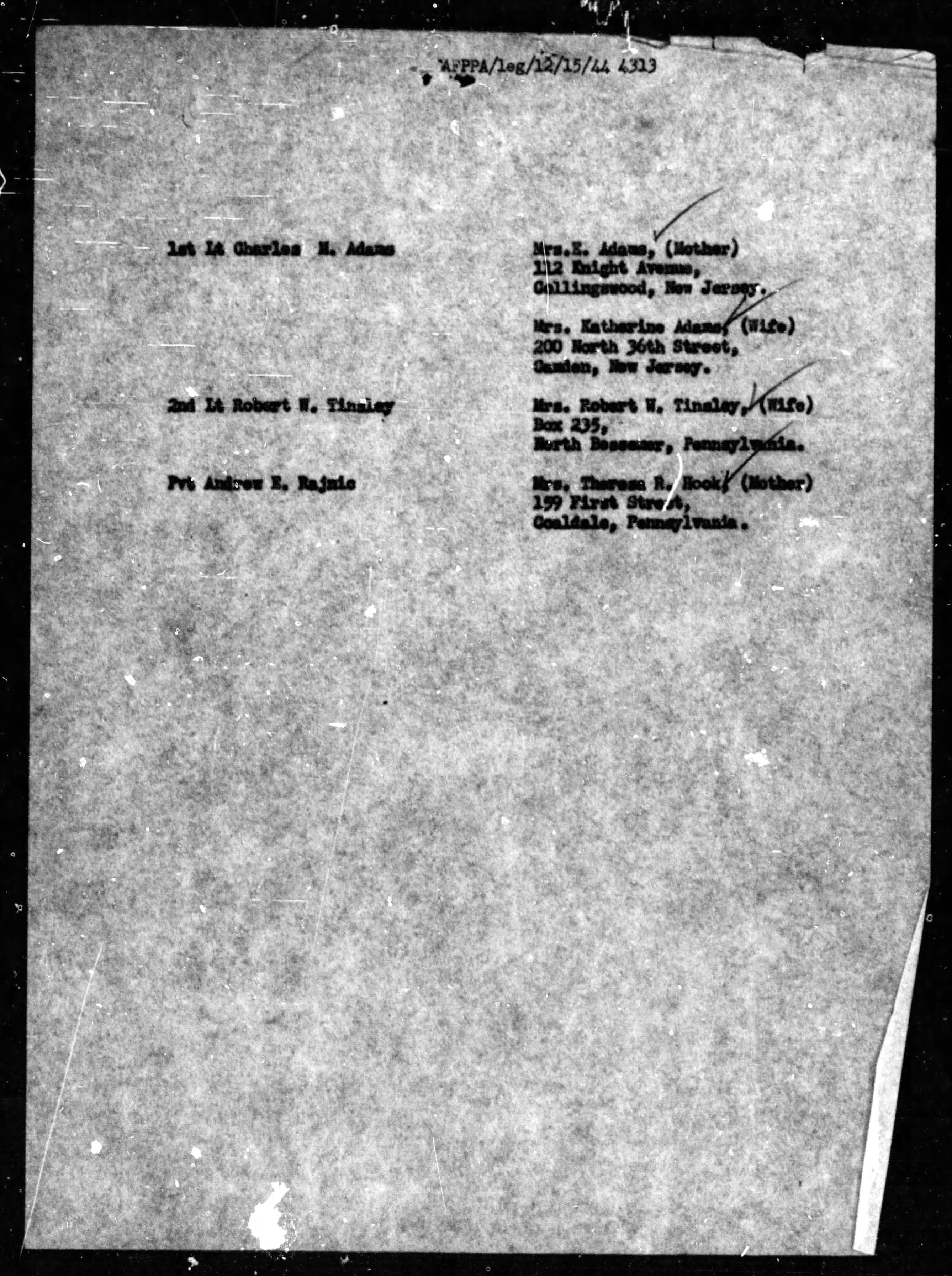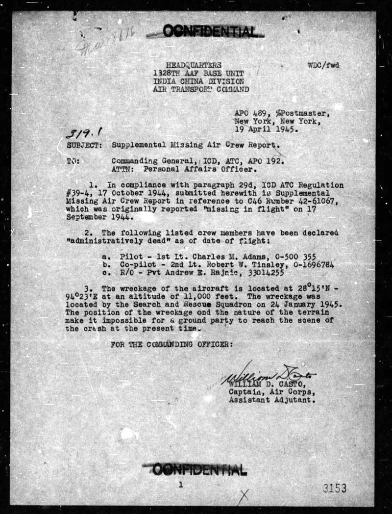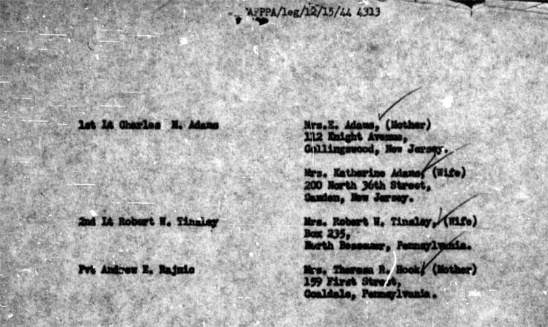 FIRST LIEUTENANT CHARLES M. ADAMS was born in 1919 to Paul and Edith Adams. He was a 1937 graduate of Camden High School. He later lived in Collingswood NJ prior to enlisting in the United States Army in September of 1941, and qualified for flight duty. He won his wings and was commissioned as a Second Lieutenant at Moody Field in Valdosta GA in August of 1942. He had married E. Katherine "Honey" Huber, who moved to 200 North 36th Street in Camden NJ after he was called to service. In September of 1943 a son, Charles M. Adams Jr. was born. Sadly, the baby died on March 6, 1944. By this time Charles Adams had been promoted to First Lieutenant. Sent overseas in August of 1944, he was serving as a pilot in the Air Transport Command, flying supplies over the Himalayan Mountains from India to Chinese armed forces. He was listed as missing in action on September 17, 1944, and later declared to be dead. He was survived by his wife, Mrs. Catherine "Honey" Huber Adams, of 200 North 36th Street, Camden NJ. The crash of his plane was reported in the October 23, 1944 edition of the Camden Courier-Post. In January of 1945 wreckage of the plane was located by air. It was not practical or possible at the time to reach the wreckage on the ground to recover remains and examine the aircraft to determine the cause of the crash. On November 23, 2009 the wreckage of a United States Army Air Force C-46A, serial number 42-61067 was located near Kayi Ligok, India by an expedition led by Clayton Kuhles, of www.MIArecoveries.org, a website whose purpose is to disseminate information about Mr. Kuhles' ongoing expeditions in Burma, India, Bangladesh and China to locate and document missing-in-action (MIA) Allied aircraft lost in that area of Asia during World War II. This aircraft had been piloted by a three-man crew, with First Lieutenant Adams serving as the co-pilot, Second Lieutenant Robert W. Tinsley, pilot, and Private First Class Andrew L. Rajnic, radio operator. This aircraft had flown a cargo of supplies, most likely fuel, from India to China and was returning to India when it was lost. Clayton Kuhles writes: This aircraft left Chanyi, China for Misamari, India on 17 September 1944 at 1104 GMT. At 1407 GMT pilot gave a position report as follows: �Over Shingbwiyang, Burma at 1350 hrs., altitude 18,000 ft., destination Misamari - request clearance to destination�. At 1413 hrs. Jorhat cleared this ship over their station at 14,000 ft., to cross Tezpur, India at 6,000 ft. to Misamari. No further contact was had with this aircraft. It is noted that the pilot gave his position report 17 minutes after passing Shingbwiyang, Burma. This could be due to poor radio contact, excessive radio traffic, or pilot being uncertain of his position. If the pilot was uncertain of his position, it is possible he may have let down with his position uncertain and collided with a mountain. The weather along Charlie route that day was continuous rain, thunderstorms, overcast, and icing between 16,000 ft. and 20,000 ft. Actually, there is no evidence upon which a reasonable assumption can be made. Dead: 3. The official report Mr. Kuhles submitted to the United States government can be viewed here. Further information can be found on Mr. Kuhles' website, www.MIArecoveries.org. If you are or are in contact with First Lieutenant Adams's family or that of his widow, please comment at the bottom of the page. Webmaster, www.dvrbs.com |