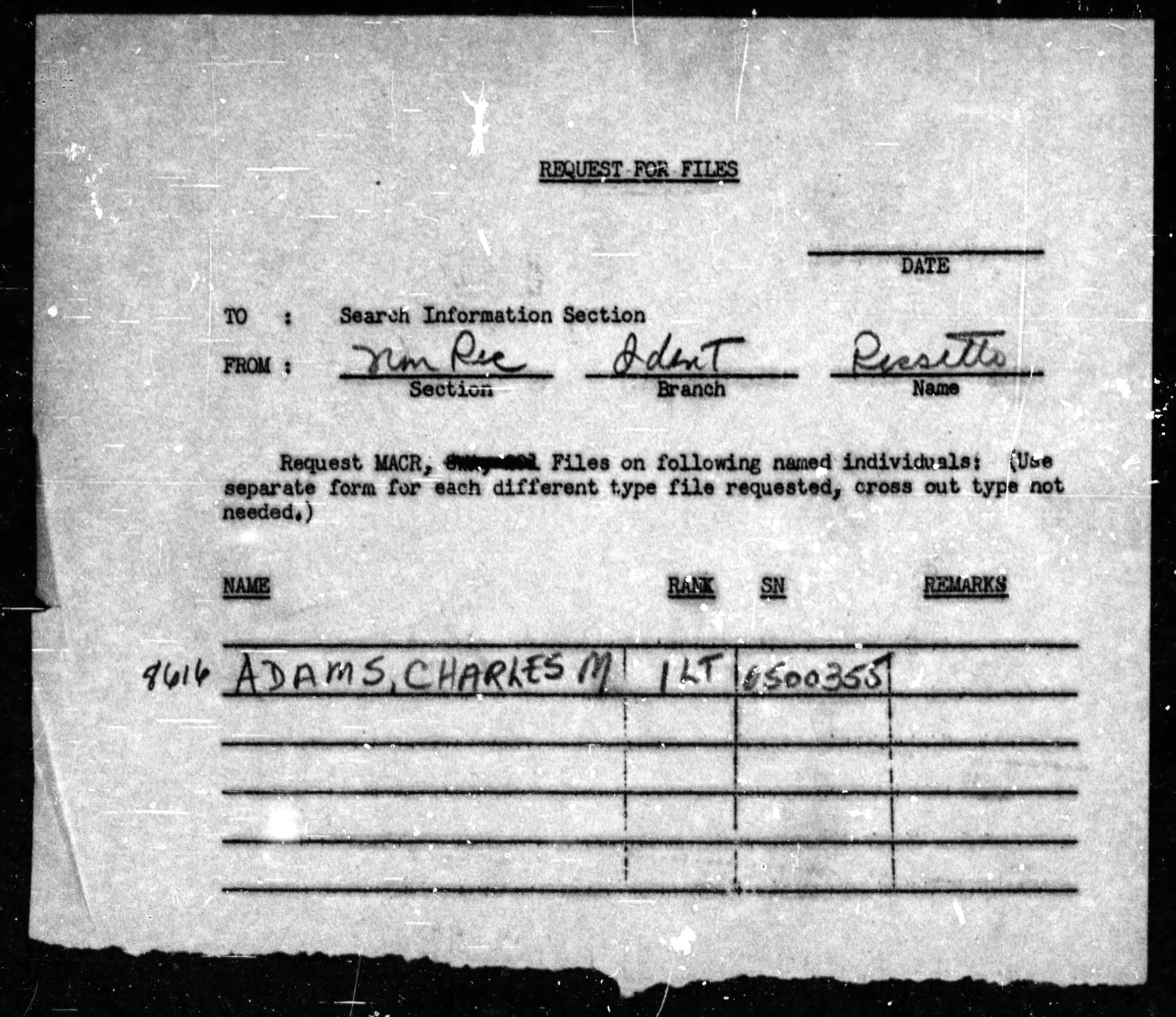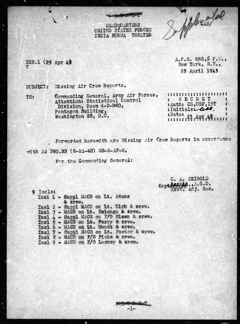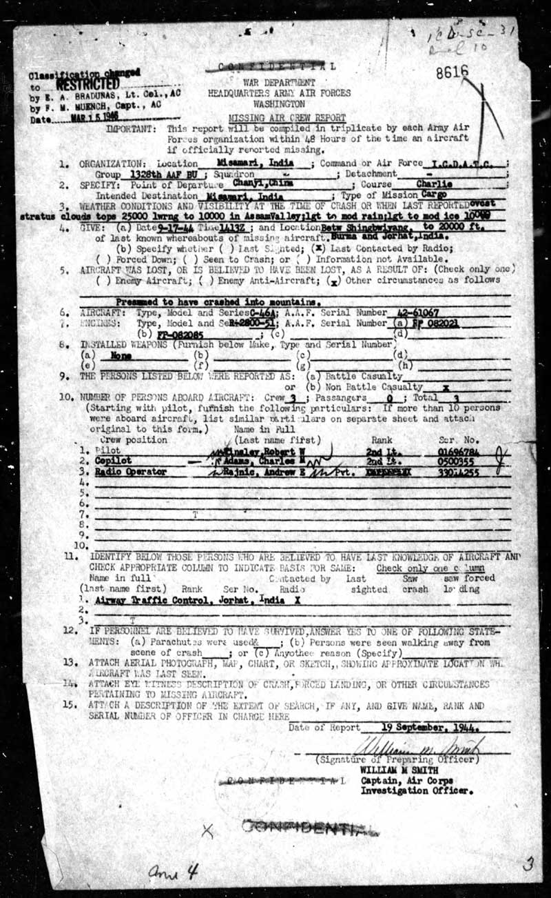 FIRST LIEUTENANT CHARLES M. ADAMS was born in 1919 to Paul and Edith Adams. He was a 1937 graduate of Camden High School. He later lived in Collingswood NJ prior to enlisting in the United States Army in September of 1941, and qualified for flight duty. He won his wings and was commissioned as a Second Lieutenant at Moody Field in Valdosta GA in August of 1942. He had married E. Katherine "Honey" Huber, who moved to 200 North 36th Street in Camden NJ after he was called to service. In September of 1943 a son, Charles M. Adams Jr. was born. Sadly, the baby died on March 6, 1944. By this time Charles Adams had been promoted to First Lieutenant. Sent overseas in August of 1944, he was serving as a pilot in the Air Transport Command, flying supplies over the Himalayan Mountains from India to Chinese armed forces. He was listed as missing in action on September 17, 1944, and later declared to be dead. He was survived by his wife, Mrs. Catherine "Honey" Huber Adams, of 200 North 36th Street, Camden NJ. The crash of his plane was reported in the October 23, 1944 edition of the Camden Courier-Post. In January of 1945 wreckage of the plane was located by air. It was not practical or possible at the time to reach the wreckage on the ground to recover remains and examine the aircraft to determine the cause of the crash. On November 23, 2009 the wreckage of a United States Army Air Force C-46A, serial number 42-61067 was located near Kayi Ligok, India by an expedition led by Clayton Kuhles, of www.MIArecoveries.org, a website whose purpose is to disseminate information about Mr. Kuhles' ongoing expeditions in Burma, India, Bangladesh and China to locate and document missing-in-action (MIA) Allied aircraft lost in that area of Asia during World War II. This aircraft had been piloted by a three-man crew, with First Lieutenant Adams serving as the co-pilot, Second Lieutenant Robert W. Tinsley, pilot, and Private First Class Andrew L. Rajnic, radio operator. This aircraft had flown a cargo of supplies, most likely fuel, from India to China and was returning to India when it was lost. Clayton Kuhles writes: This aircraft left Chanyi, China for Misamari, India on 17 September 1944 at 1104 GMT. At 1407 GMT pilot gave a position report as follows: �Over Shingbwiyang, Burma at 1350 hrs., altitude 18,000 ft., destination Misamari - request clearance to destination�. At 1413 hrs. Jorhat cleared this ship over their station at 14,000 ft., to cross Tezpur, India at 6,000 ft. to Misamari. No further contact was had with this aircraft. It is noted that the pilot gave his position report 17 minutes after passing Shingbwiyang, Burma. This could be due to poor radio contact, excessive radio traffic, or pilot being uncertain of his position. If the pilot was uncertain of his position, it is possible he may have let down with his position uncertain and collided with a mountain. The weather along Charlie route that day was continuous rain, thunderstorms, overcast, and icing between 16,000 ft. and 20,000 ft. Actually, there is no evidence upon which a reasonable assumption can be made. Dead: 3. The official report Mr. Kuhles submitted to the United States government can be viewed here. Further information can be found on Mr. Kuhles' website, www.MIArecoveries.org. If you are or are in contact with First Lieutenant Adams's family or that of his widow, please comment at the bottom of the page. Webmaster, www.dvrbs.com |