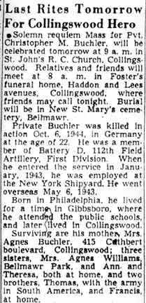 Cunningham The Buchlers were a deeply religious Catholic family. In the winter of 1929, young Christopher was about to make his first Holy Communion but had taken ill. In a dream, he received a visitation from St. Therese the Little Flower of Lisieux, France. Click here for the story of Christopher's Rose, as related by is neice, Roberta Ann Matysik-Marziani. By 1930 the Buchler family, which included Christopher, sisters Agnes and Anna, and brother Thomas, lived at 2121 Alden Street in Philadelphia. Sister Theresa and brother Frank Buchler came along afterwards. At the time of the census Joseph Buchler was then working as an electrician at a street car works. The family later moved across the river, to Collingswood NJ. Christopher Buchler lived at 15 West Stiles Avenue, Collingswood NJ when he was inducted into the United States Army. His brother Thomas also served in the Army. Private Buchler was killed in action on October 6, 1944 in Germany, at the age of 22. He had been overseas since March of 1943. Anna Buchler had proudly displayed the Blue Star Banner when her sons went to the service, and the Gold Star Banner after her son was killed. At the time of Private Buchler's death, his brother Thomas was a corporal in the army then serving in Italy. Private Buchler was brought home after the war, and was buried at New St. Mary's Cemetery in Bellmawr NJ, with full military honors o May 4, 1949. He was survived by his mother, brothers Frank and Thomas, and his sisters, Mrs. Anna Matysik, Mrs. Theresa Voshell, and Mrs. Agnes Williams. His name also appears on the World War II War Memorial at Knight's park in Collingswood NJ, and on the Camden County World War II Memorial inside of City Hall in Camden NJ. |