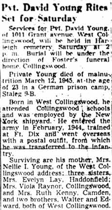 PRIVATE DAVID A. YOUNG was born in 1921 in New Jersey to Edward L. and Nellie Young, of 1011 Grant Avenue in Collingswood NJ. He was the youngest of at least seven children, coming after Viola, Walter P., Evelyn W., Thomas P., Edward L. Jr., and Ruth Young. His father worked as a cabinetmaker at the time of the 1920 census. Edward L. Young Sr. was born in 1864, and was 18 years his wife's senior. He passed away prior to the April 1930 census. David Young attended Collingswood High School, as a member of the 1941 class, but did not complete his education there, leaving school after his junior year. He worked as a wood patternmaker prior to being drafted. David Young was received his call for the draft into the United States Army on January 2, 1943, and was inducted on February 2, 1943. He went overseas as a member of a postal unit. He was transferred to the infantry in 1944, when the need for replacements became such that support units were mobilized. On December 20, 1944 Private Young was reported to have been taken prisoner by German forces. He died of malnutrition while a prisoner at Stalag 9B near Bad Orb, north of Frankfurt, Germany on March 12, 1945. at the age of 23. David Young was brought home in the fall of 1948, and buried at Harleigh Cemetery in Camden NJ on December 11th of that year. |