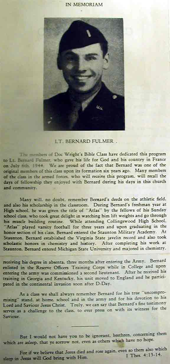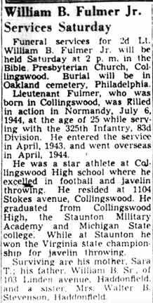 SECOND LIEUTENANT WILLIAM BERNARD FULMERJR. was born on June 6, 1919. His father was the chief statistician for the Pennsylvania Railroad in Philadelphia. As a youth he lived at 1104 Stokes Avenue in Collingswood NJ, and he was a 1937 graduate of Collingswood High School, where he played three years of football and was an honors graduate. Known as Bernard, "Bud", and "Atlas", he won a $500 athletic scholarship to Staunton Military Academy in Staunton VA. At Staunton he set a Virginia State record for the javelin. After graduating from Staunton in 1939, he was an Honors appointee to West Point. He passed the mental examination, but failed an eye test. William Bernard Fulmer then completed his degree in chemistry at Michigan State University on an ROTC scholarship, in March of 1943. On April 1, 1943 Fulmer reported for active duty, and was send to officers Candidate School at Fort Benning GA. He graduated on July 1 and was commissioned as a Second Lieutenant. He was then sent to the Method of Training School at Fort Wheeler GA. Lt. Fulmer was asked twice if he would stay on at either school as an instructor. He refused, and requested combat duty. In September of 1943 he was sent to Camp Breckenridge KY, where he was assigned to a heavy weapons platoon in the 83rd Infantry Division. He shipped out with his unit via Fort Devens MA for England in May of 1944. killed on July 6, 1944 near Coulette, France, while leading his men along a hedgerow during the hedgerow fighting in Normandy. Lieutenant Fulmer was buried at the St. Mere Eglise Cemetery #2. His body was returned to the United States in the spring of 1949. He was buried at Oakland cemetery in Philadelphia PA on May 21, 1949, where he rests by his father, who passed six months later, on November 21, 1949. |